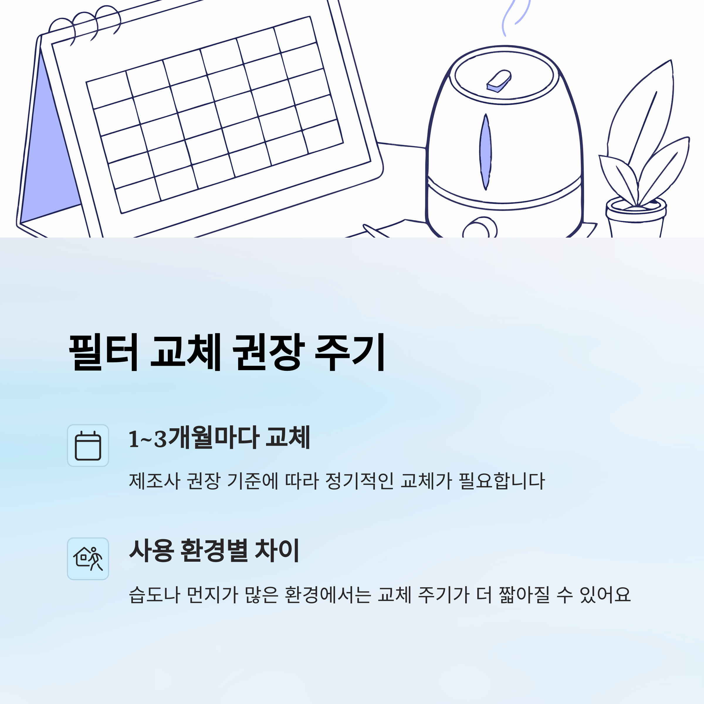 초음파 가습기 필터 | 2~3개월 | 사용량 많을 경우 2개월 | 전문가 권장 기준 |
