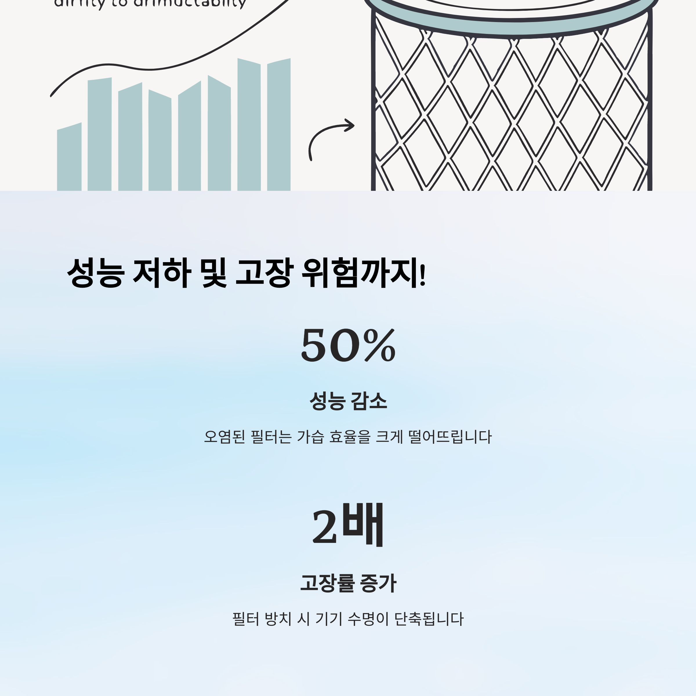 필터가 막히면 가습량이 최대 30~50%까지 감소합니다. 동시에 팬과 모터에 과부하가 걸려 소음이 심해지고, 고장률이 증가하며 가습기 수명도 20~30%나 단축될 수 있습니다.