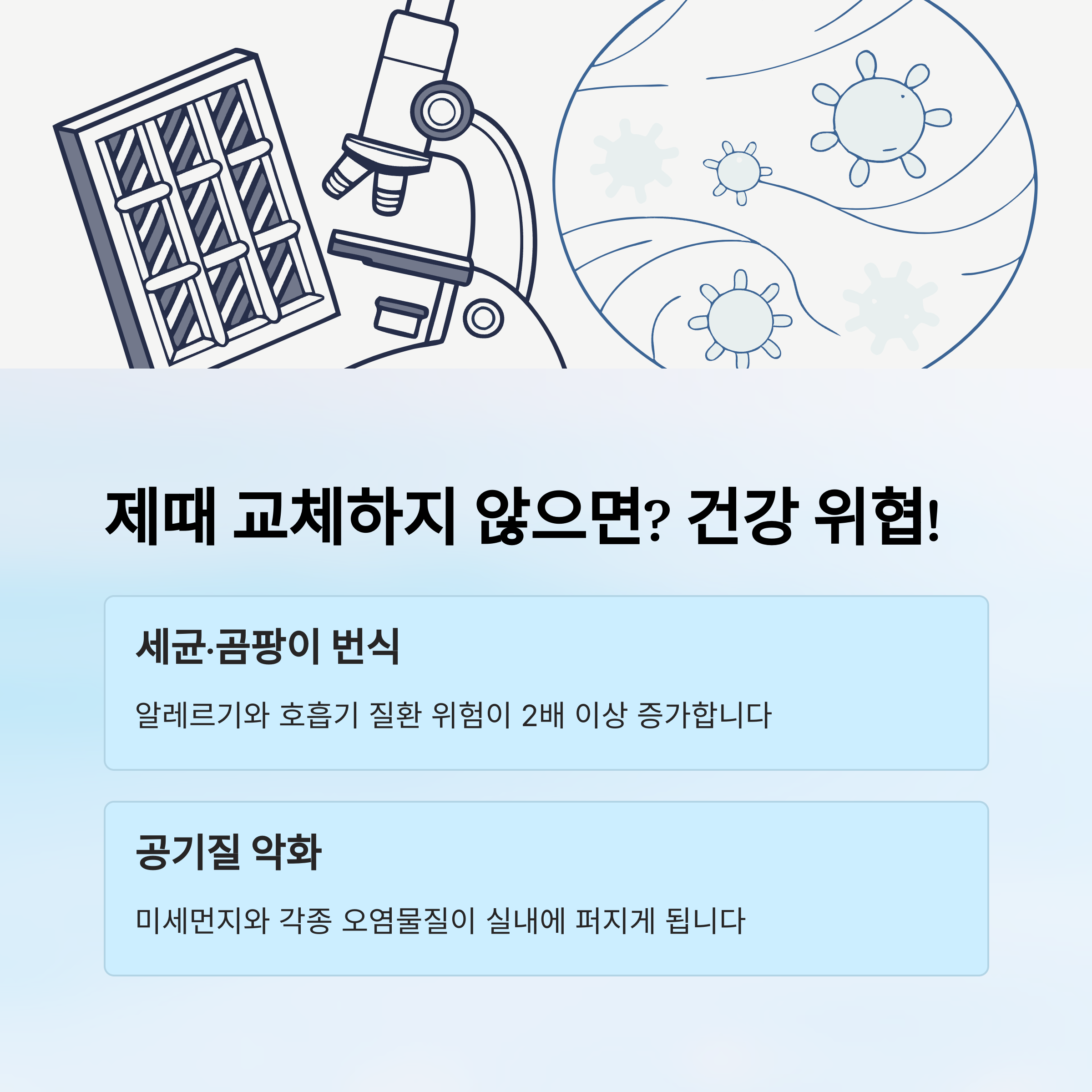 오염된 필터는 세균, 곰팡이, 바이러스 번식의 온상이 될 수 있습니다. 이로 인해 호흡기 질환, 알레르기, 천식 악화, 심지어 폐렴까지 유발할 수 있습니다. 특히 어린이와 노약자는 더 민감하게 반응하므로 더욱 주의해야 합니다.