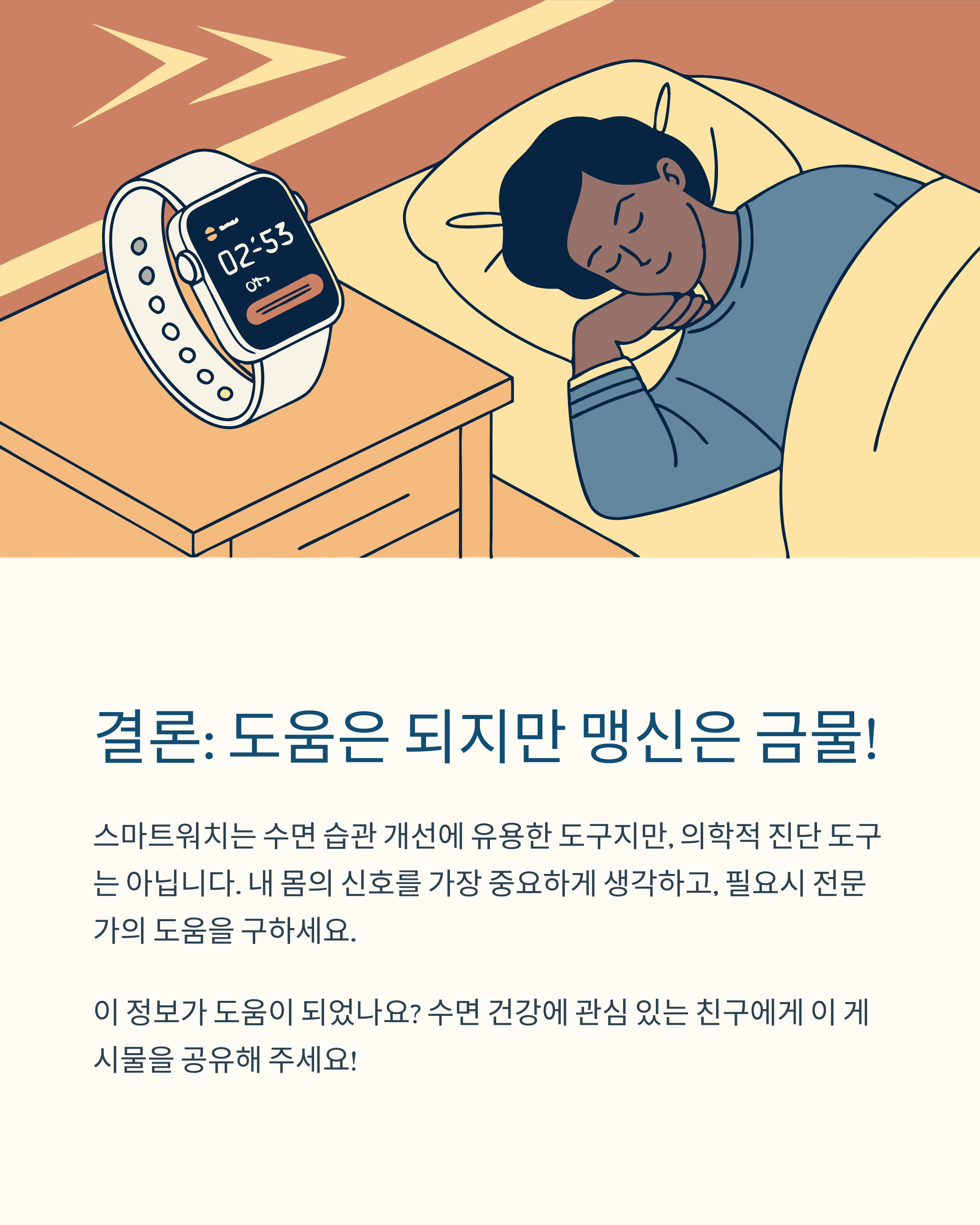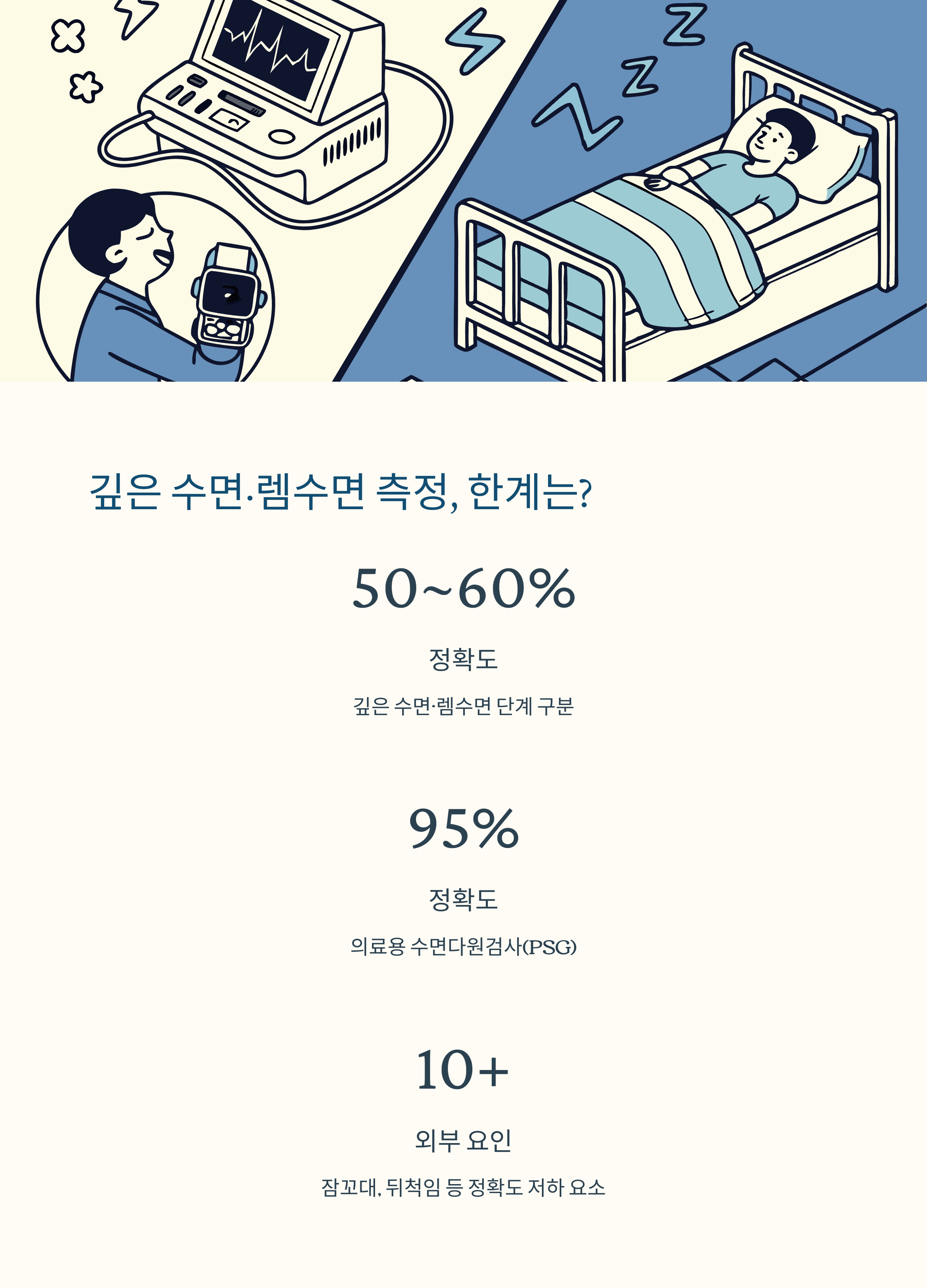 스마트워치는 심박수와 움직임으로 수면을 측정합니다. | 수면 단계 구분 정확도는 50~60%로 다소 낮습니다. | 일부 최신 기종은 수면무호흡 감지 기능을 지원합니다. |