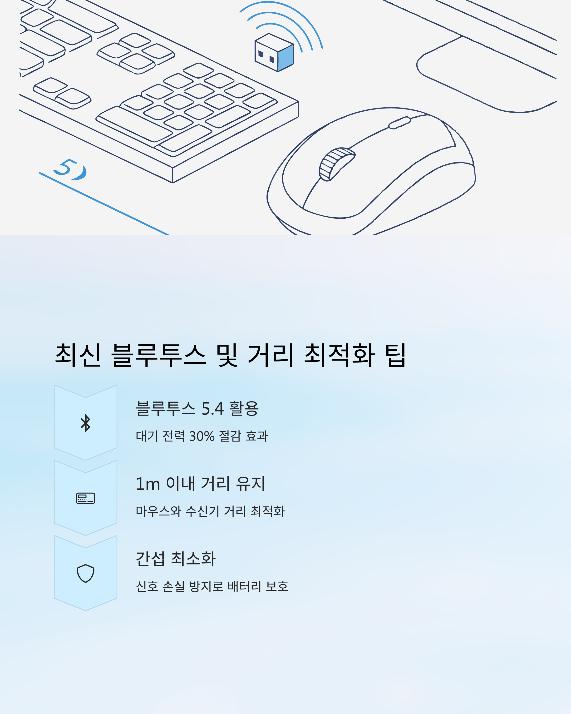또한 마우스와 동글(USB 수신기) 간 거리를 1m 이내로 유지하면 신호 손실 ↓ 배터리 소모 ↓ 됩니다.