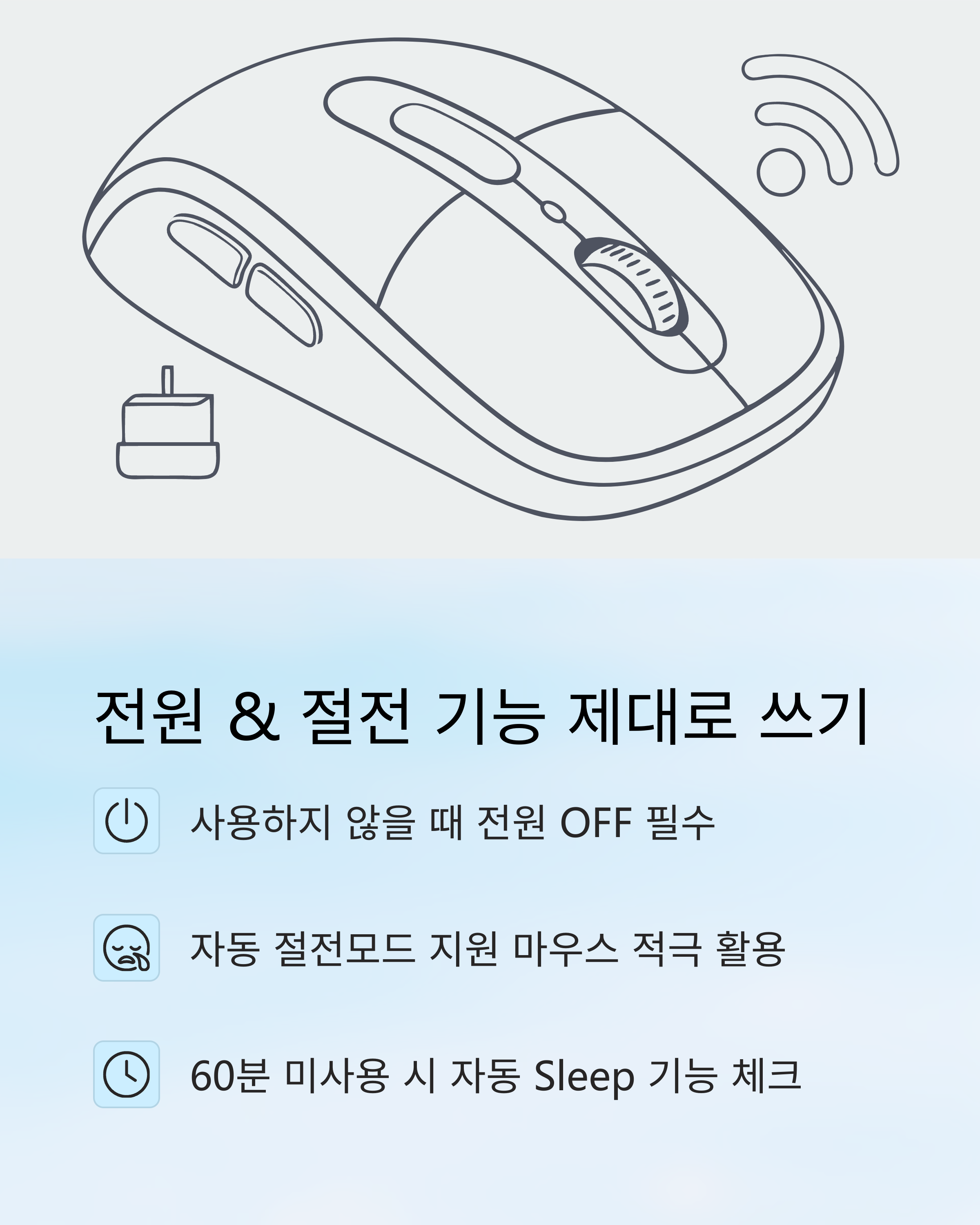 무선 마우스 배터리 소모 원인의 40% 이상이 ‘항상 켜진 상태’ 때문이라고 해요!