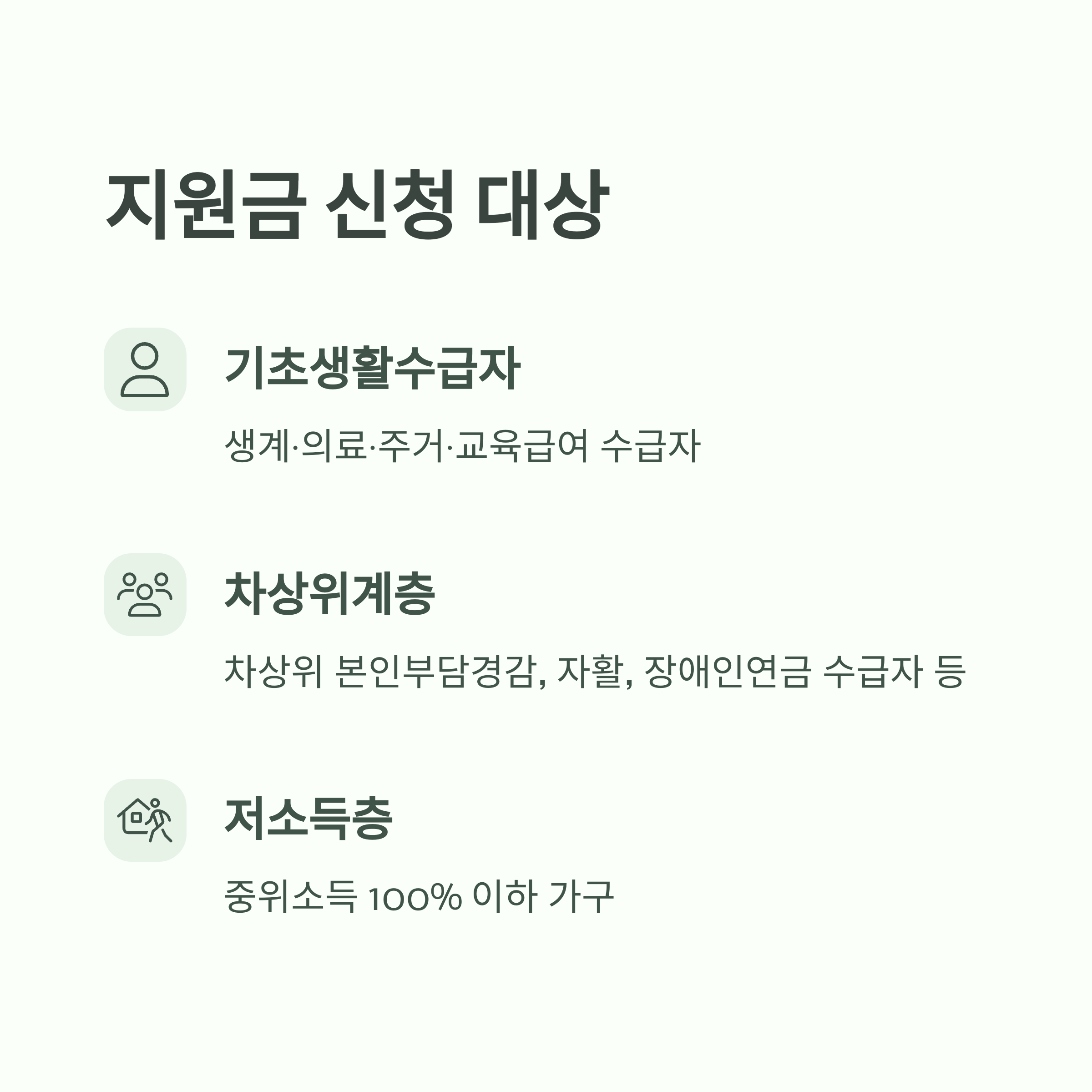 기초생활수급자 | 생계·의료·주거·교육급여 수급자 |