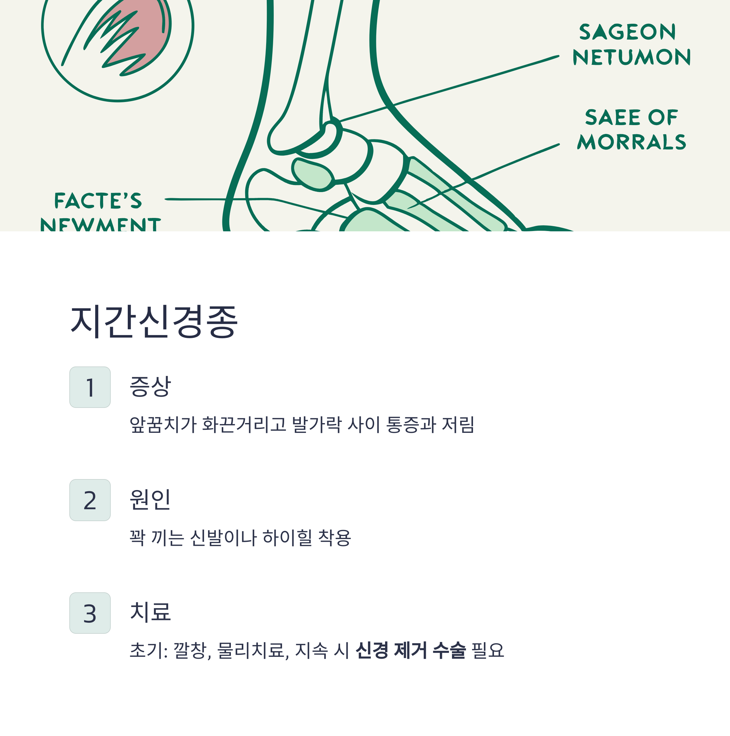발가락 사이 신경이 두꺼워지며 통증과 저림을 유발하는 질환입니다.