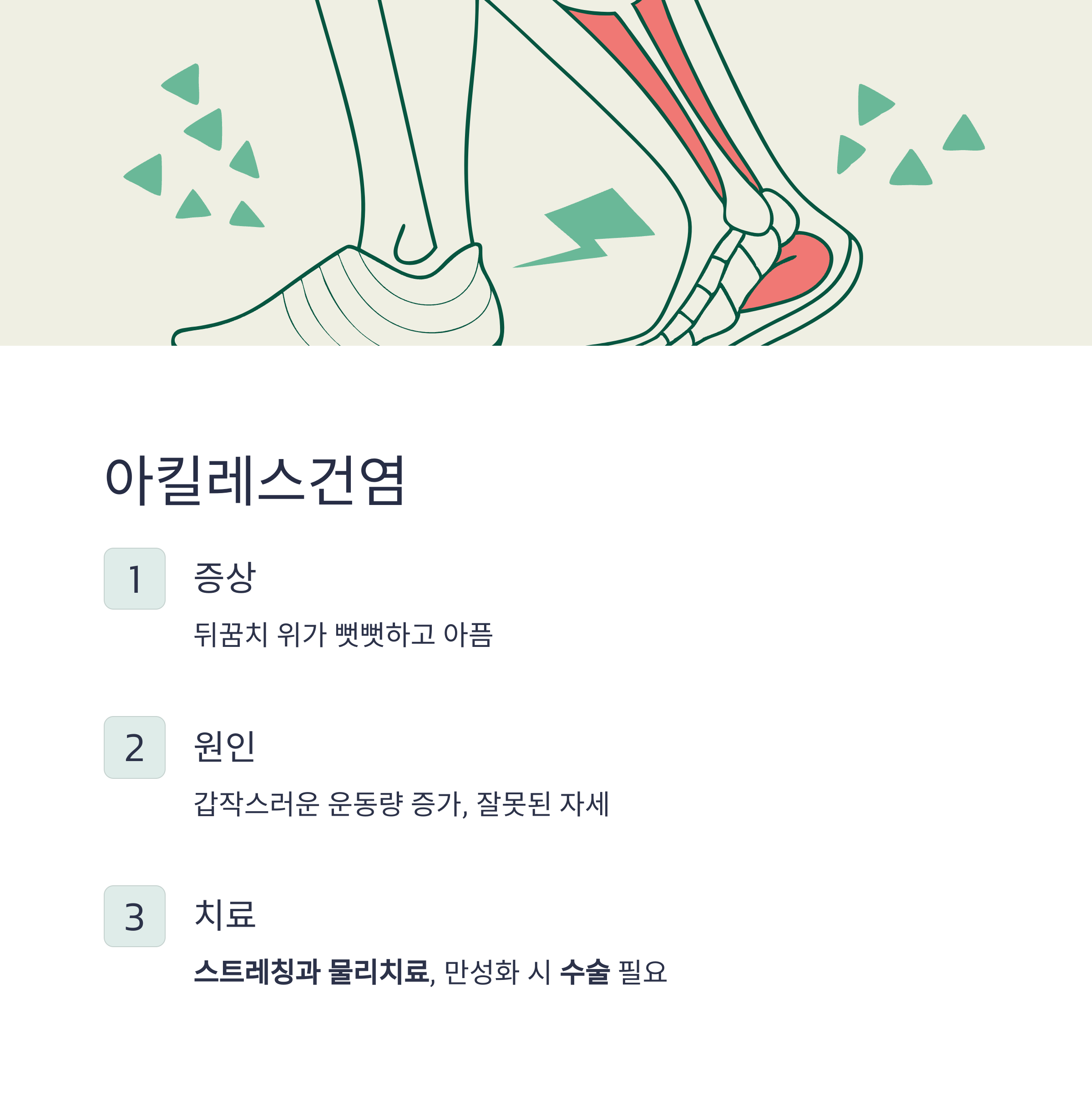 | 아킬레스건염 | 스트레칭, 운동 조절 | 중간 |