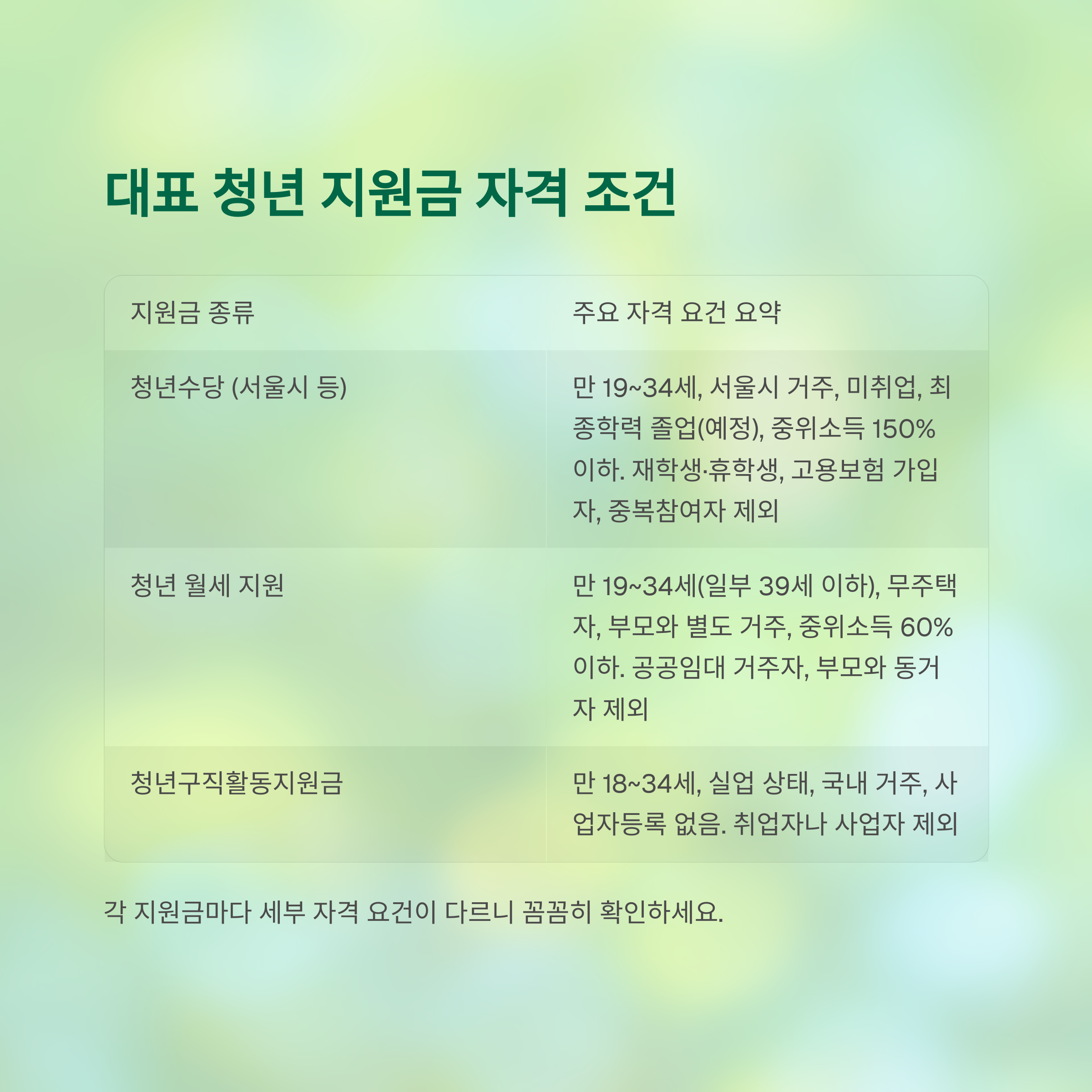 아래 표는 청년 지원금별 핵심 자격 요건을 정리한 내용입니다.