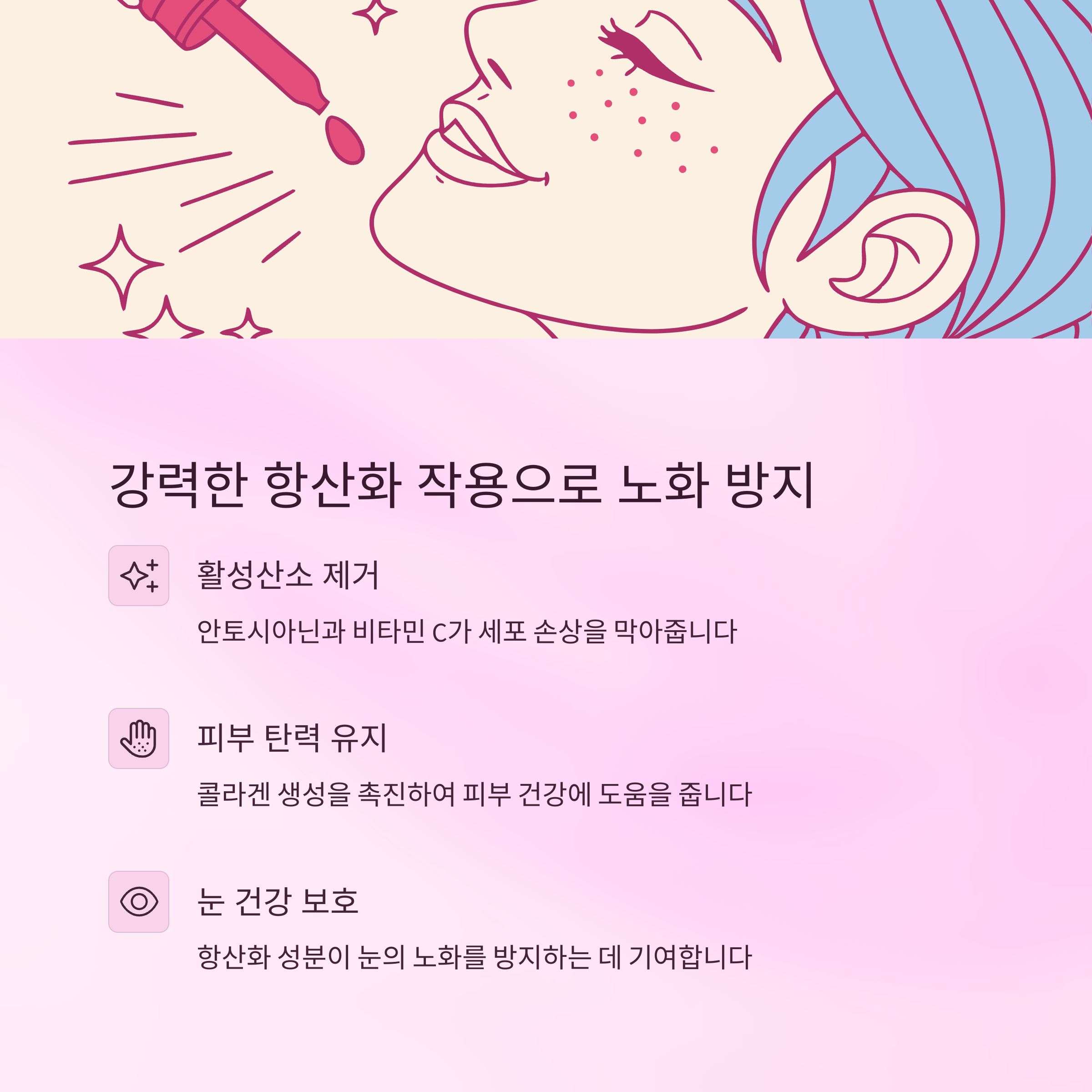 이로 인해 피부 탄력 유지, 눈 건강 보호, 노화 방지에 도움을 줄 수 있습니다.