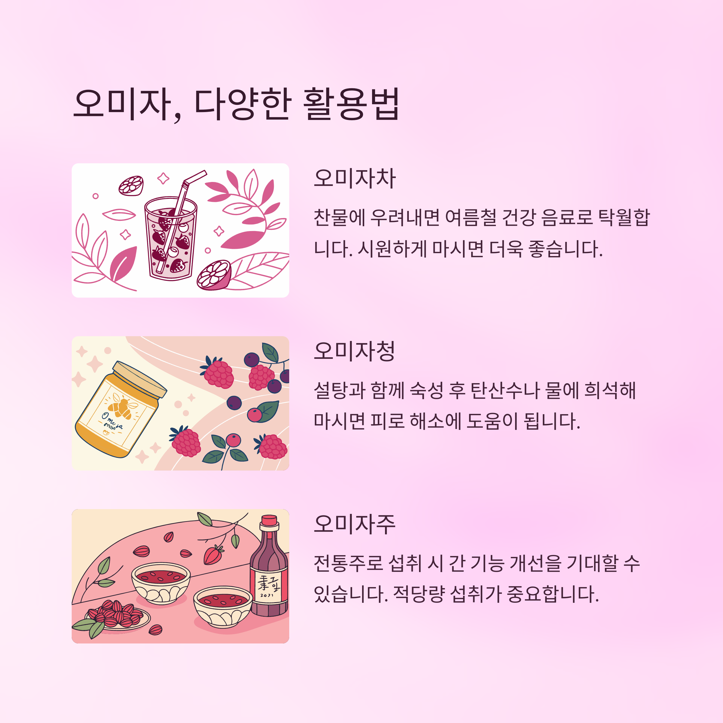 오미자 속 쉬잔드린은 간세포 재생과 해독을 돕는 성분으로 알려져 있습니다.