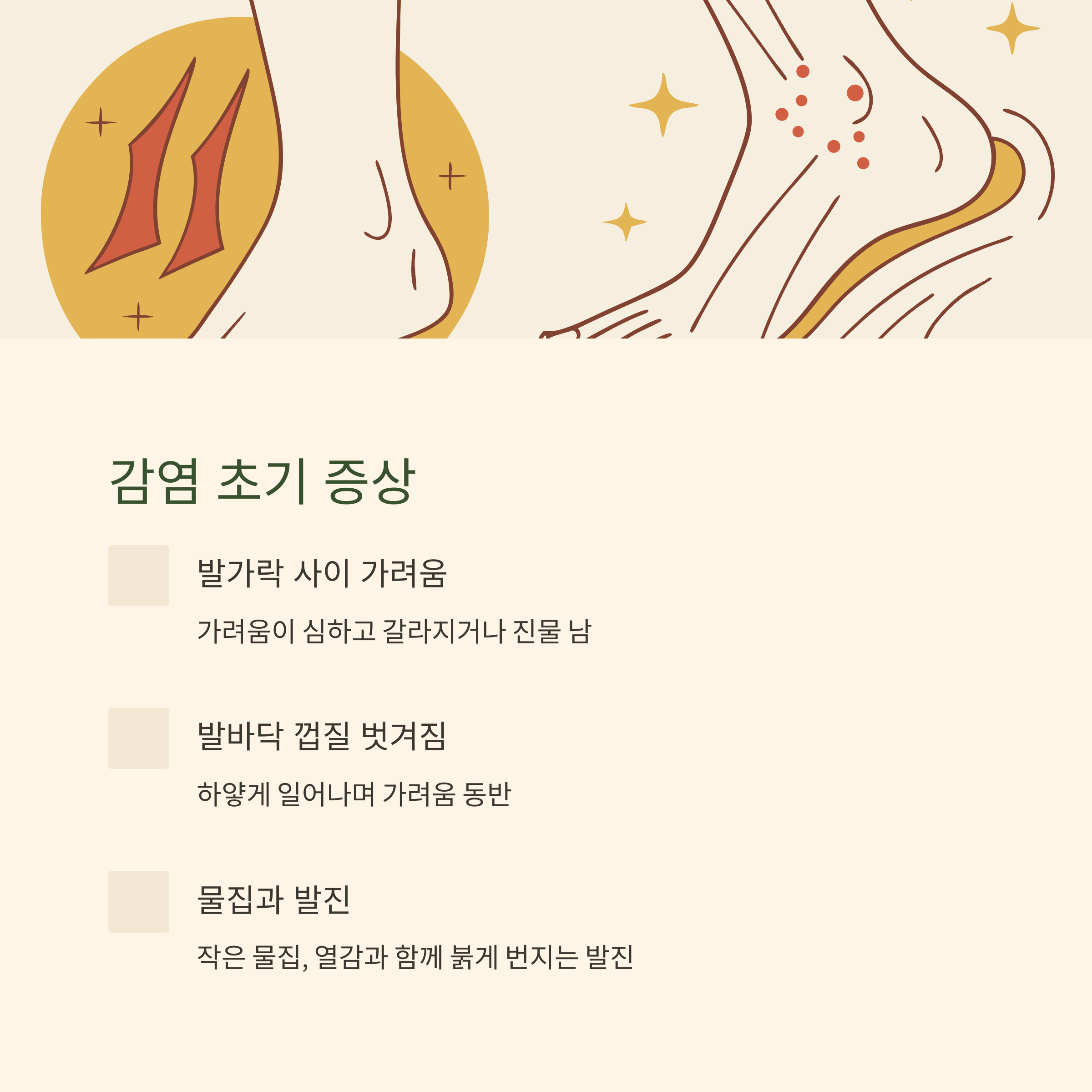 | 발가락 사이 가려움 | 가려움이 심하고 갈라지거나 진물 남 |