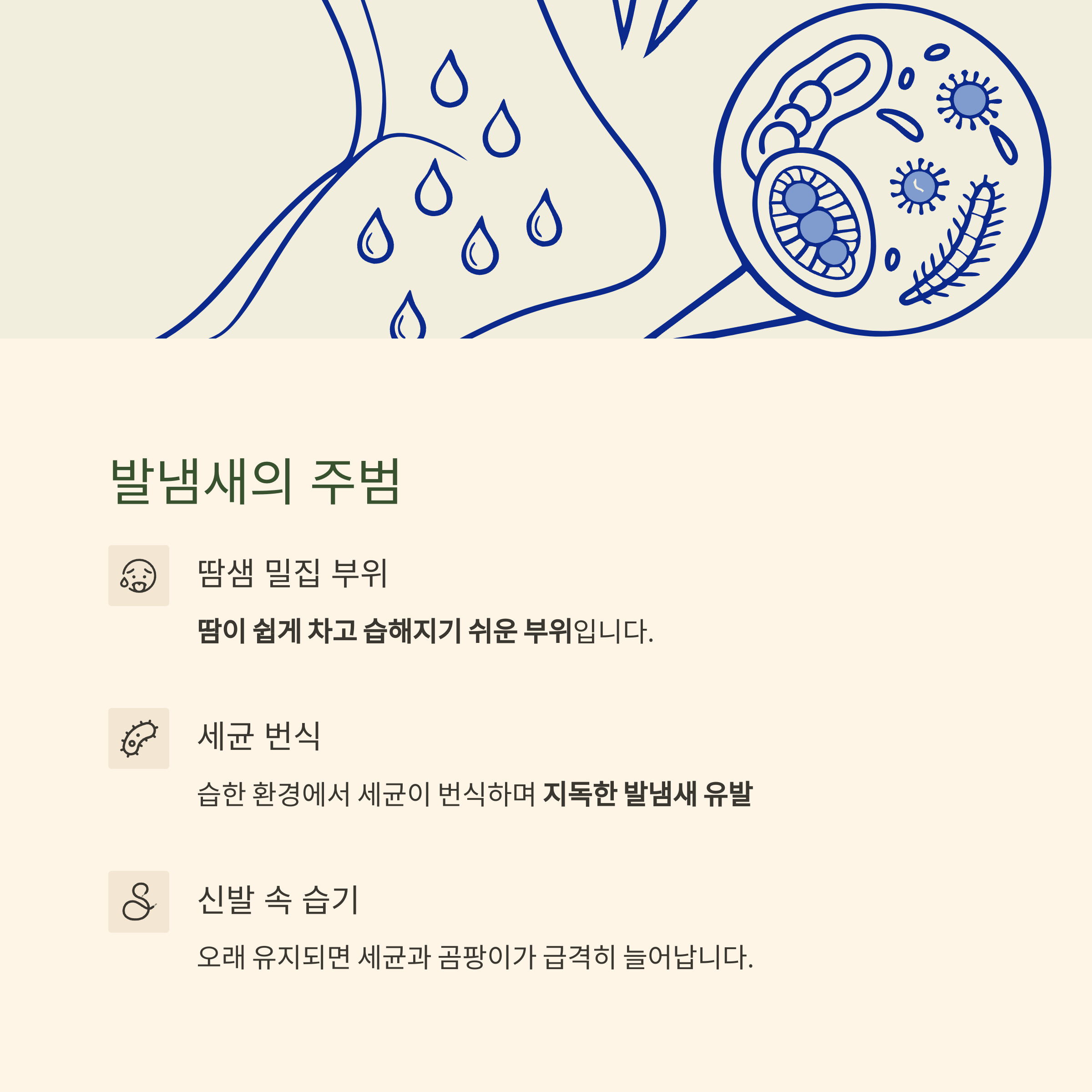 | 통풍 안 되는 신발 | 땀이 마르지 않아 세균 번식 유발 |