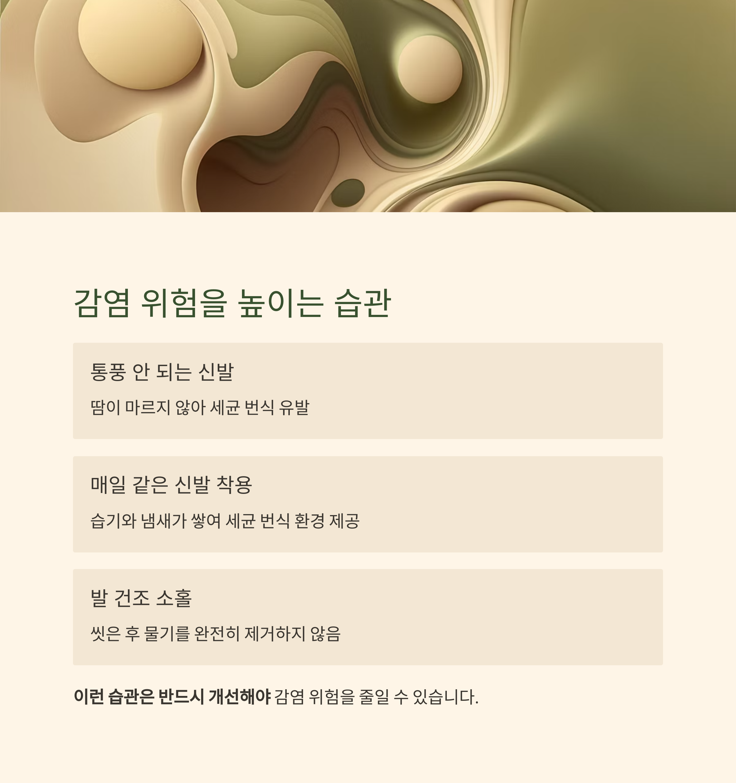 | 발 건조 소홀 | 씻은 후 물기를 완전히 제거하지 않음 |
