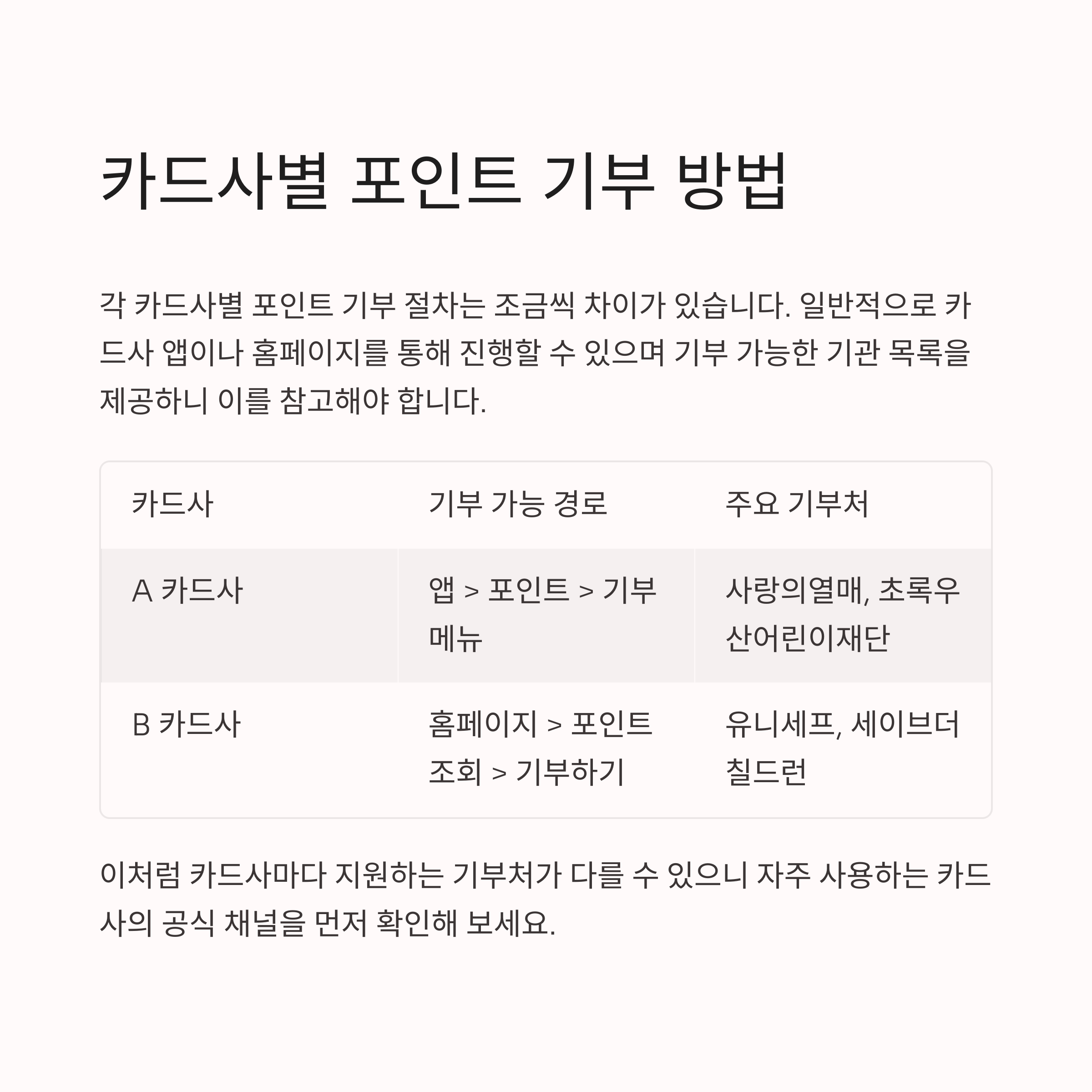 각 카드사별 포인트 기부 절차는 조금씩 차이가 있습니다.