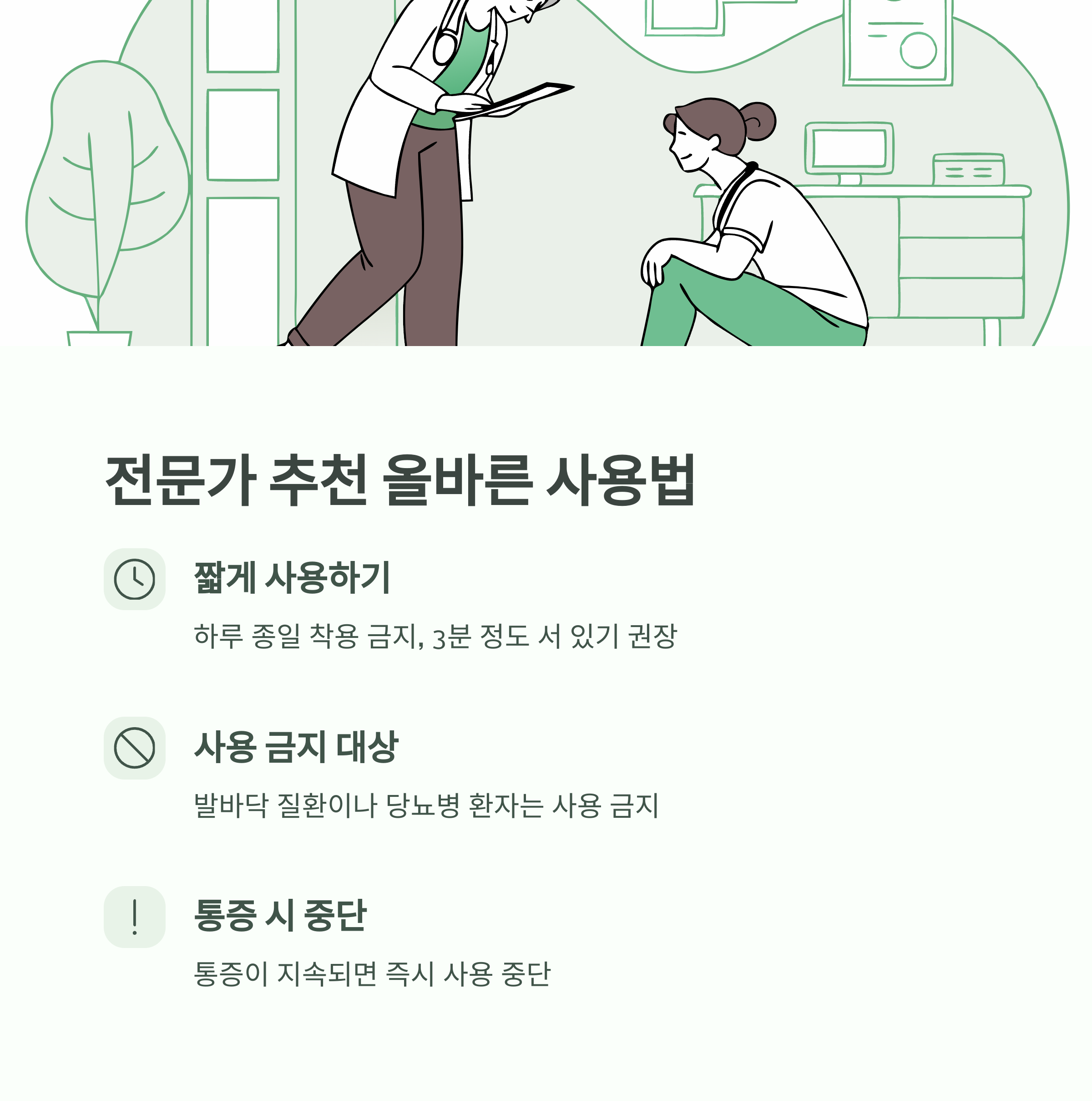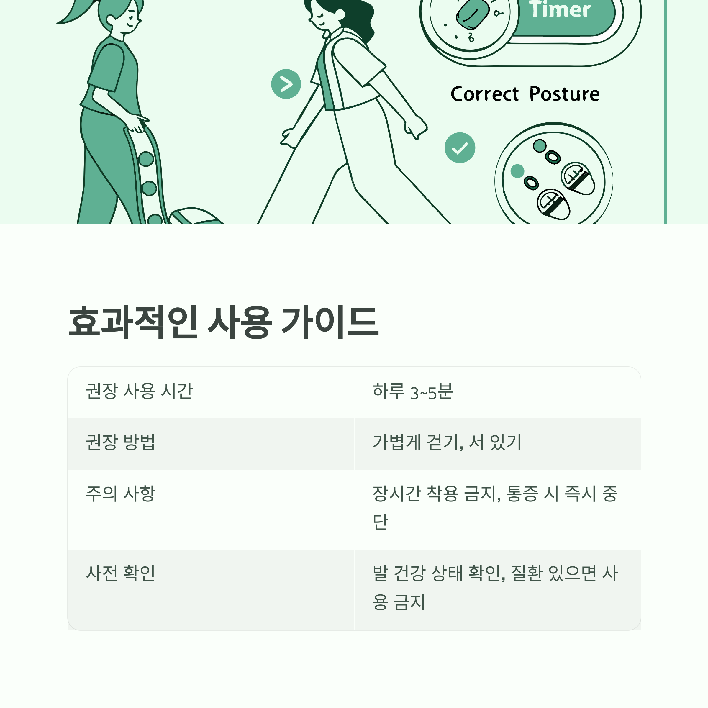 | 하루 3~5분 | 가볍게 걷기, 서 있기 | 장시간 착용 금지 |