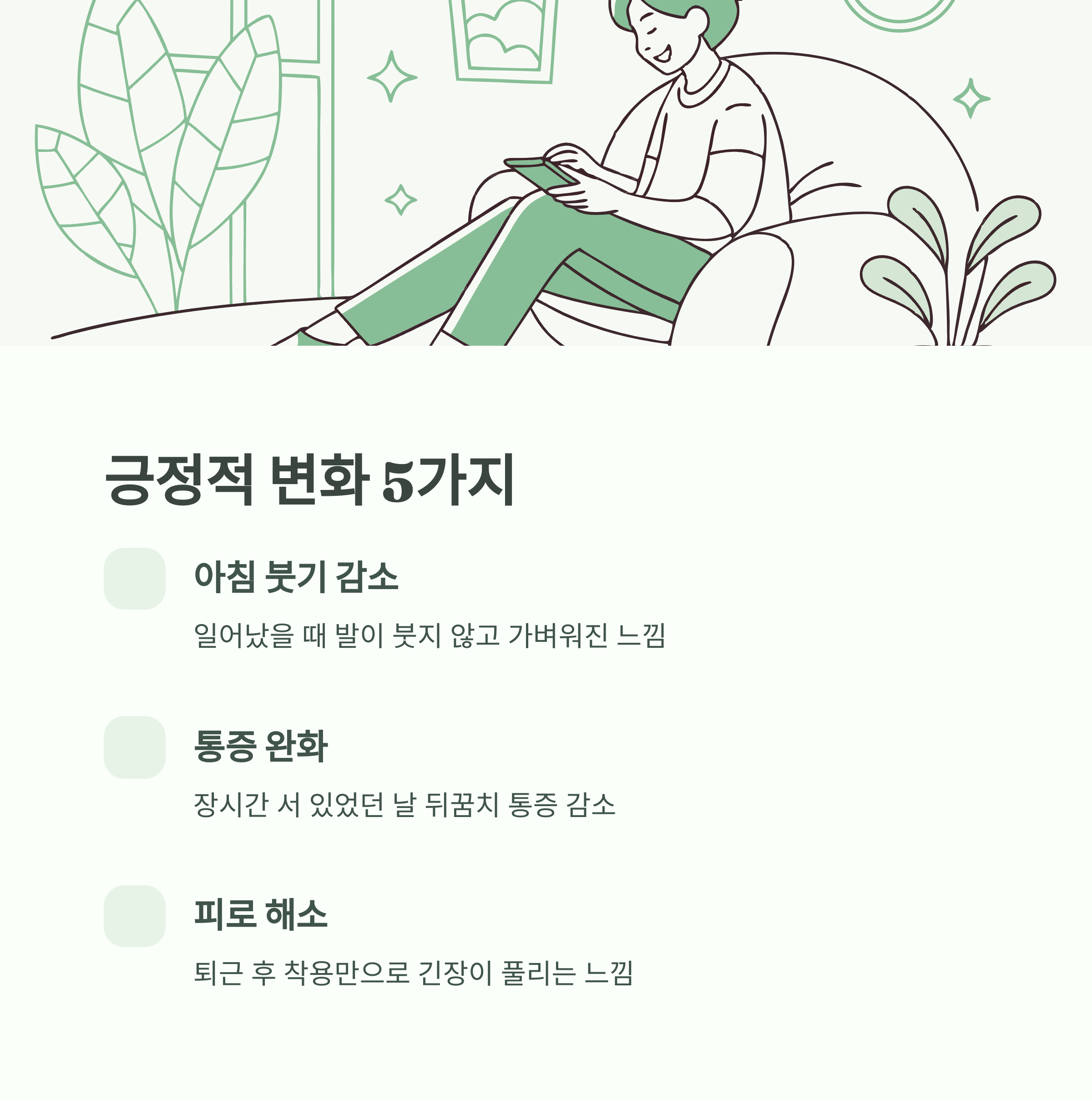 | 발 붓기, 무거운 느낌 | 아침에 가벼운 발 느낌 |