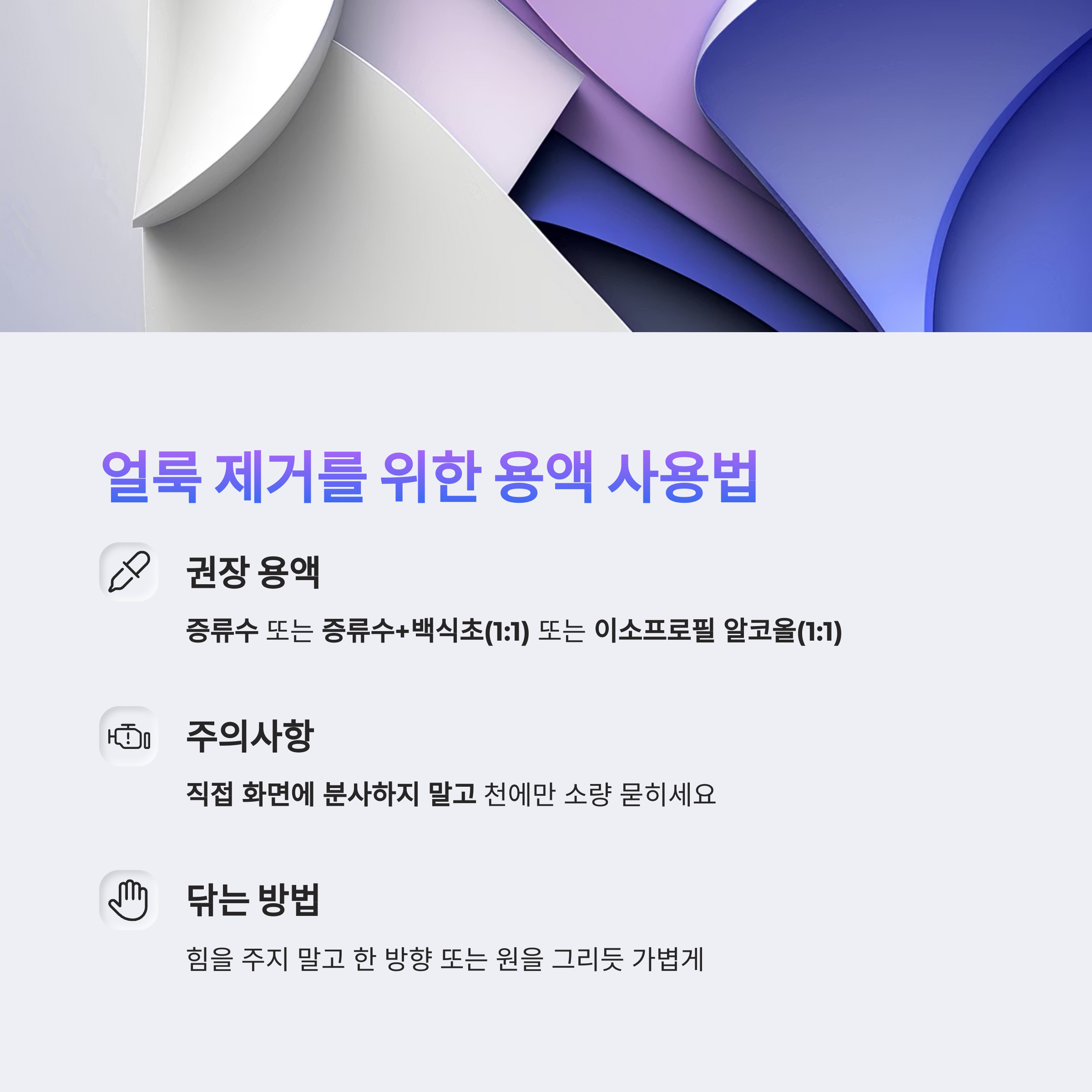 얼룩 제거 | 극세사 천+소량 용액 | 직접 분사 금지, 힘주지 않기 |