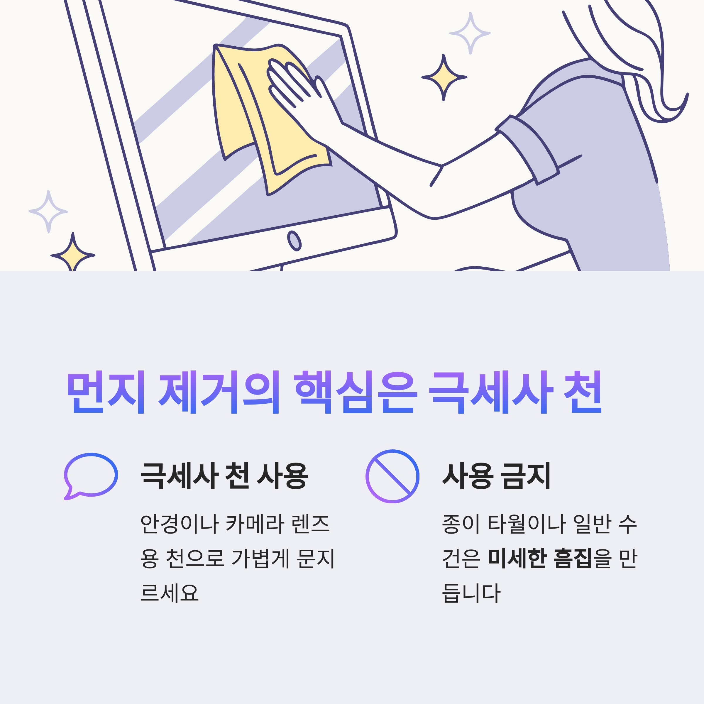 먼지 제거 | 마른 극세사 천 | 거친 천·종이타월 금지 |