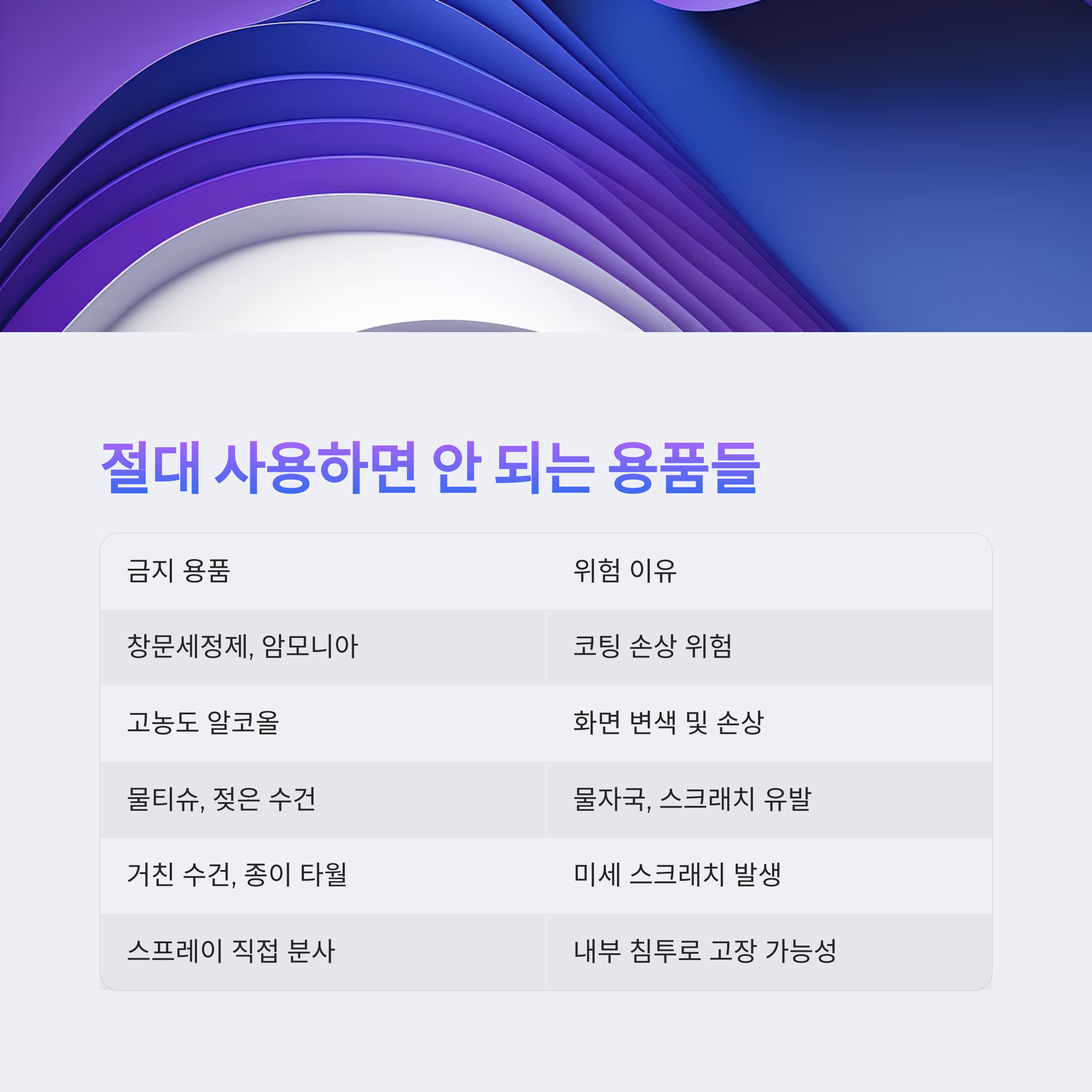 사용 금지 | 창문세정제, 암모니아, 물티슈 등 | 코팅 손상·스크래치·고장 유발 위험 |