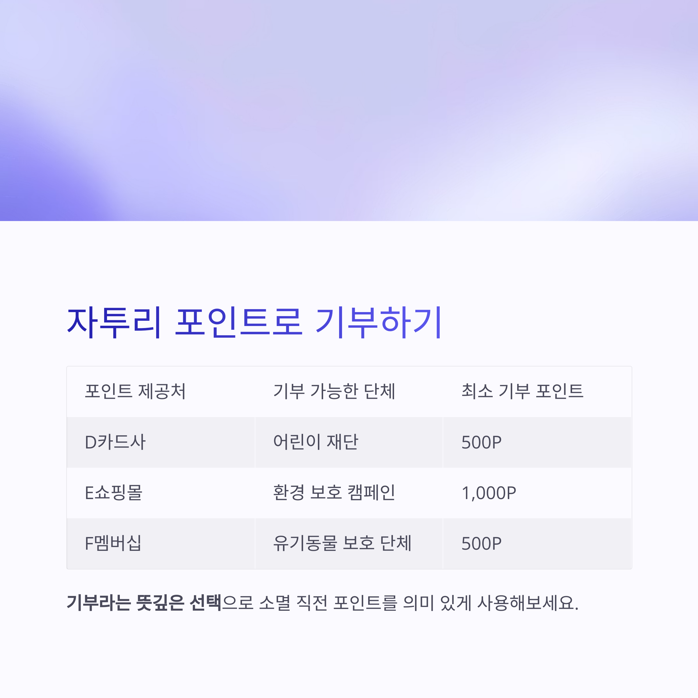 포인트 제공처 | 기부 가능한 단체 | 최소 기부 포인트 |