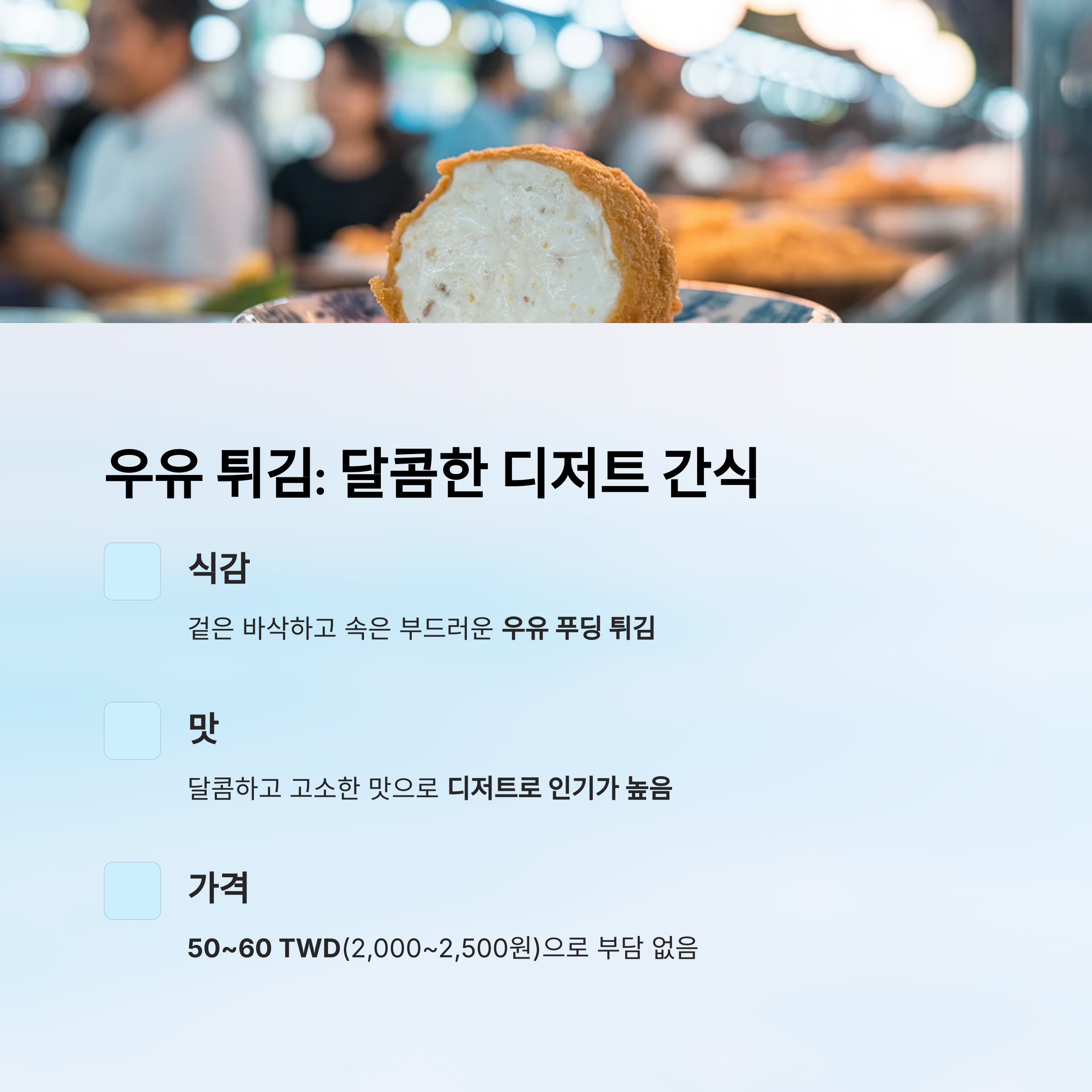 우유 튀김 | 스린 | 50~60 | 바삭+부드러움, 디저트로 인기 |