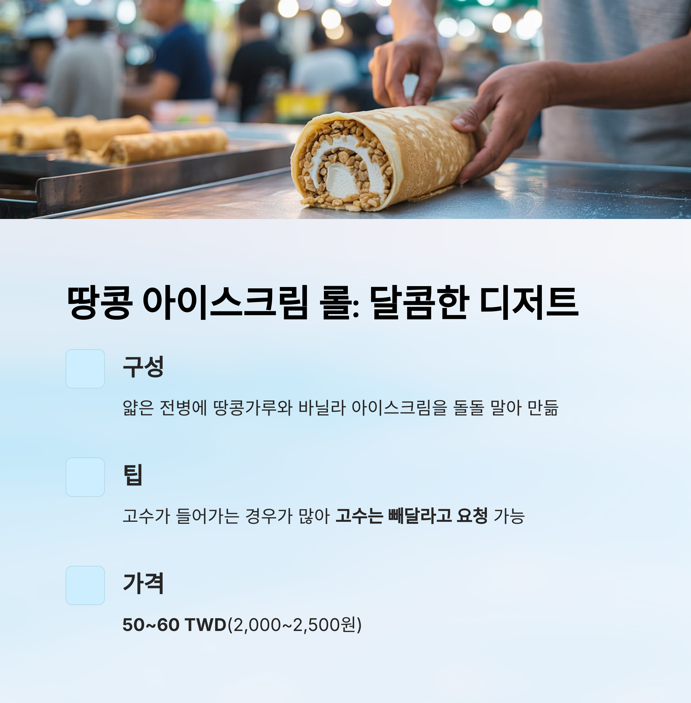 땅콩 아이스크림 롤 | 멍샤, 스린 | 50~60 | 달콤함, 고수 선택 가능 |