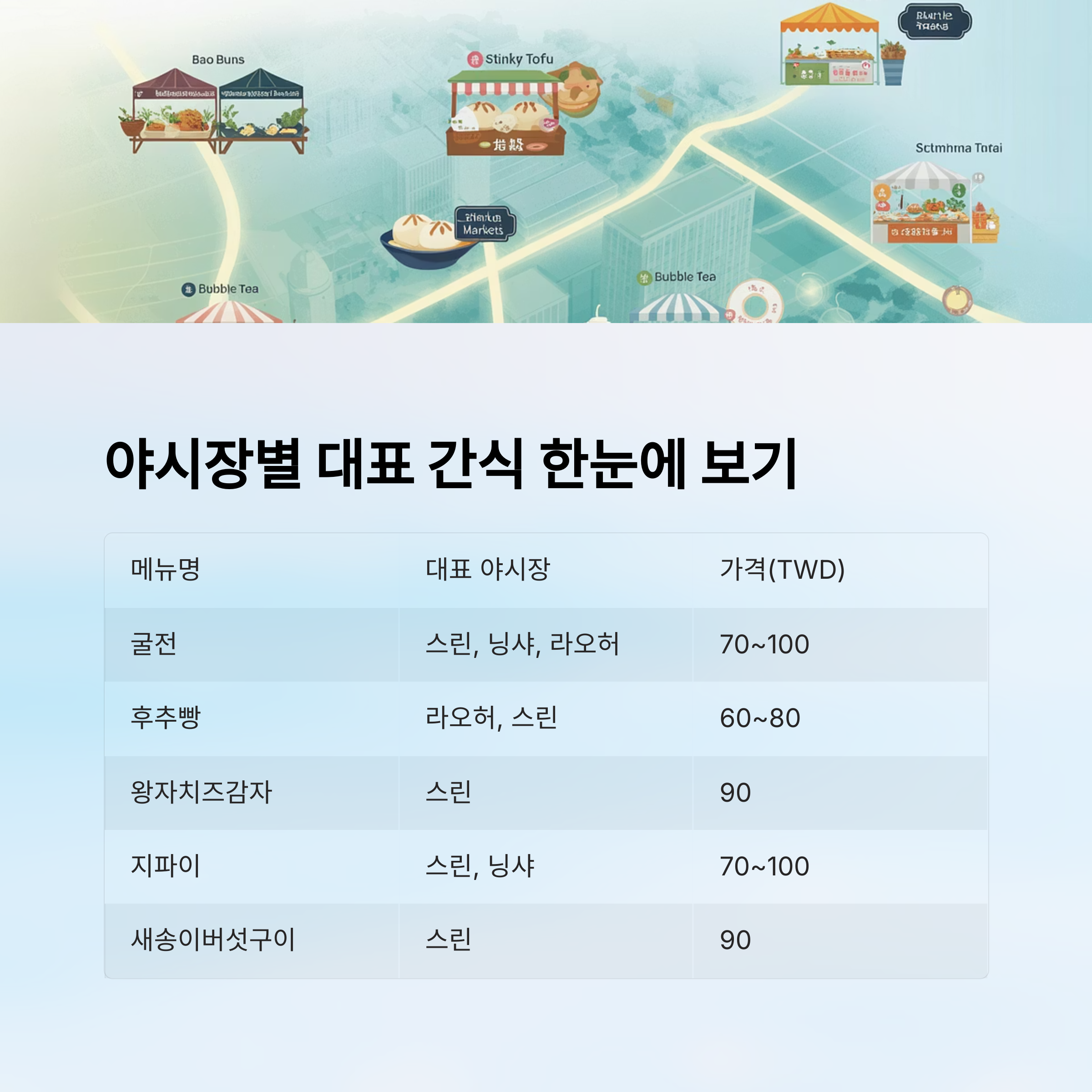 메뉴명 | 대표 | 야시장 가격(TWD) | 인기 / 특징 |