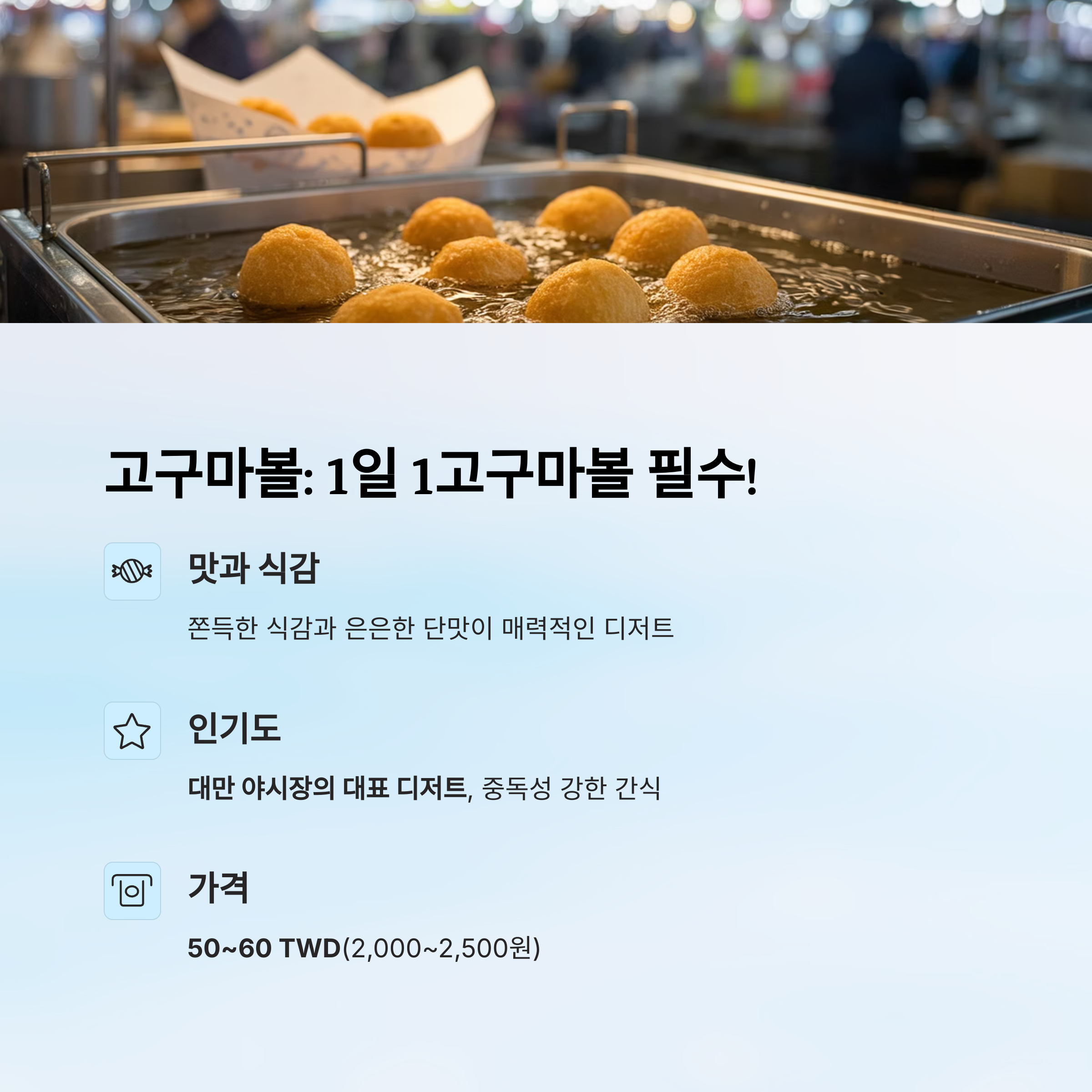 굴전 | 스린, 닝샤, 라오허 | 70~100 | 4.9/5 평점, 대만 대표 간식 |
