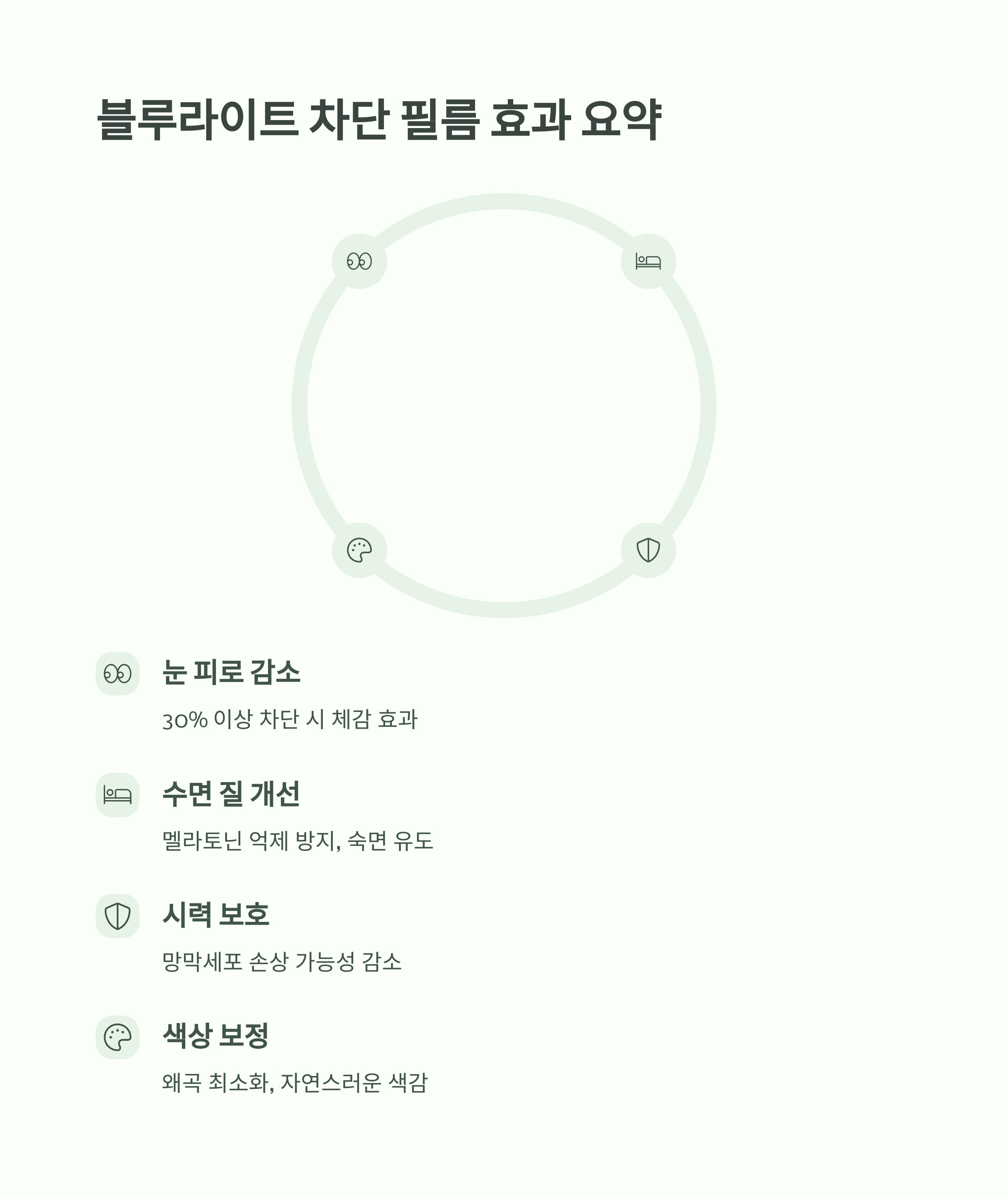| 눈의 피로 감소 | 30% 이상 차단 시 체감 효과 확인 |