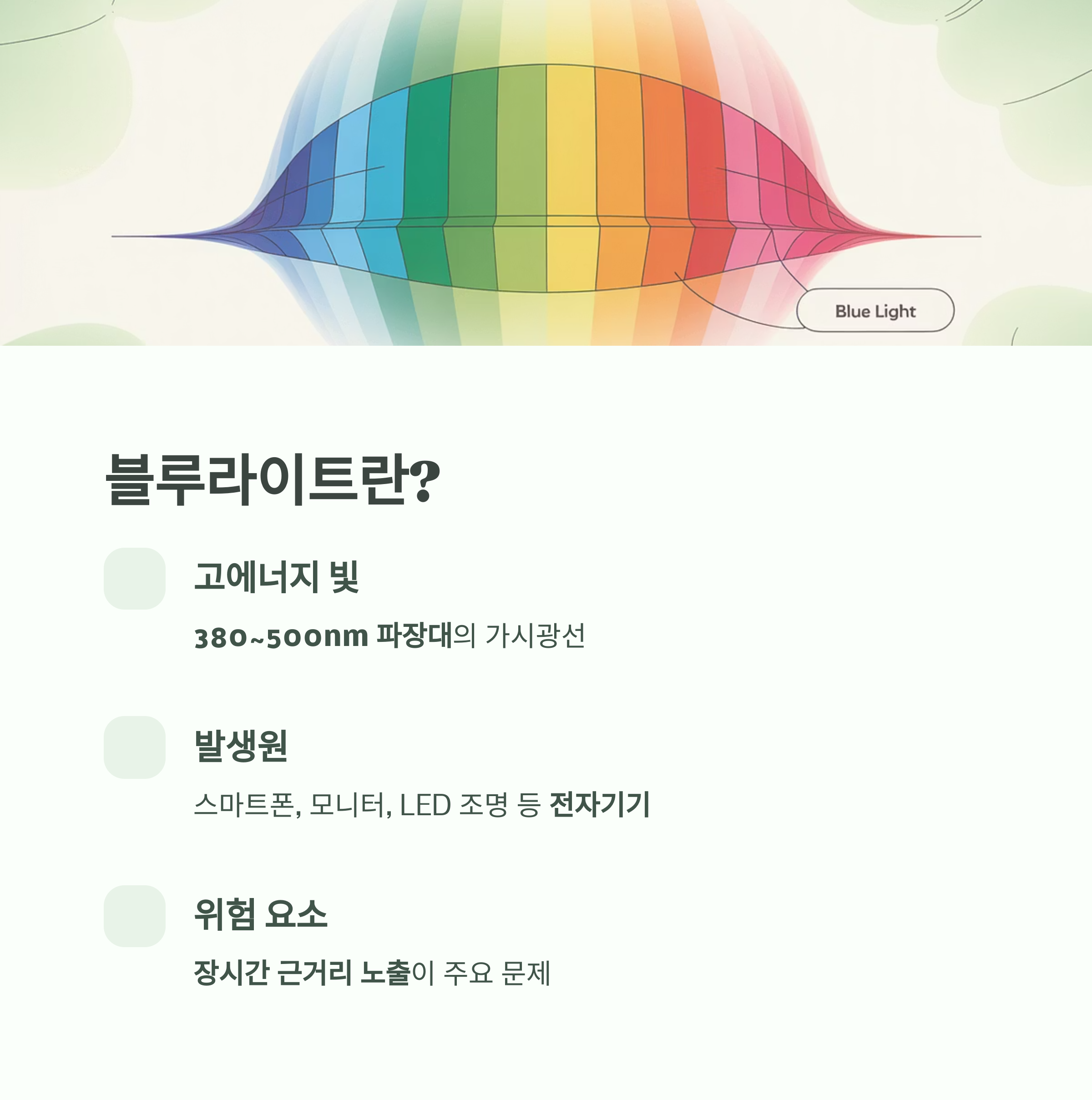 블루라이트는 가시광선 중에서도 380~500nm 파장대의 고에너지 빛입니다.