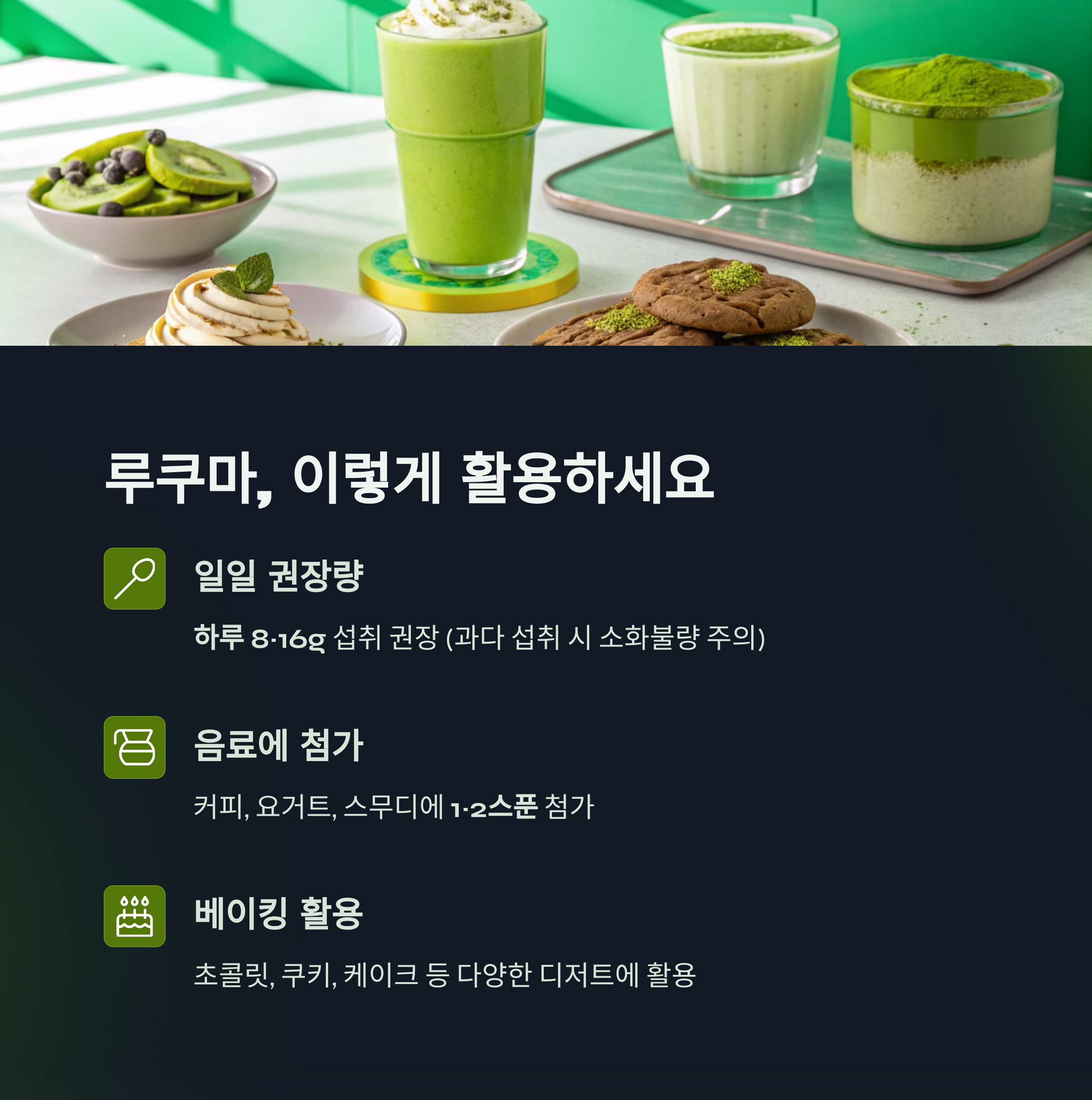- 설탕 대신 루쿠마 분말 1~2스푼을 커피, 요거트, 스무디, 베이킹 재료에 넣어 사용