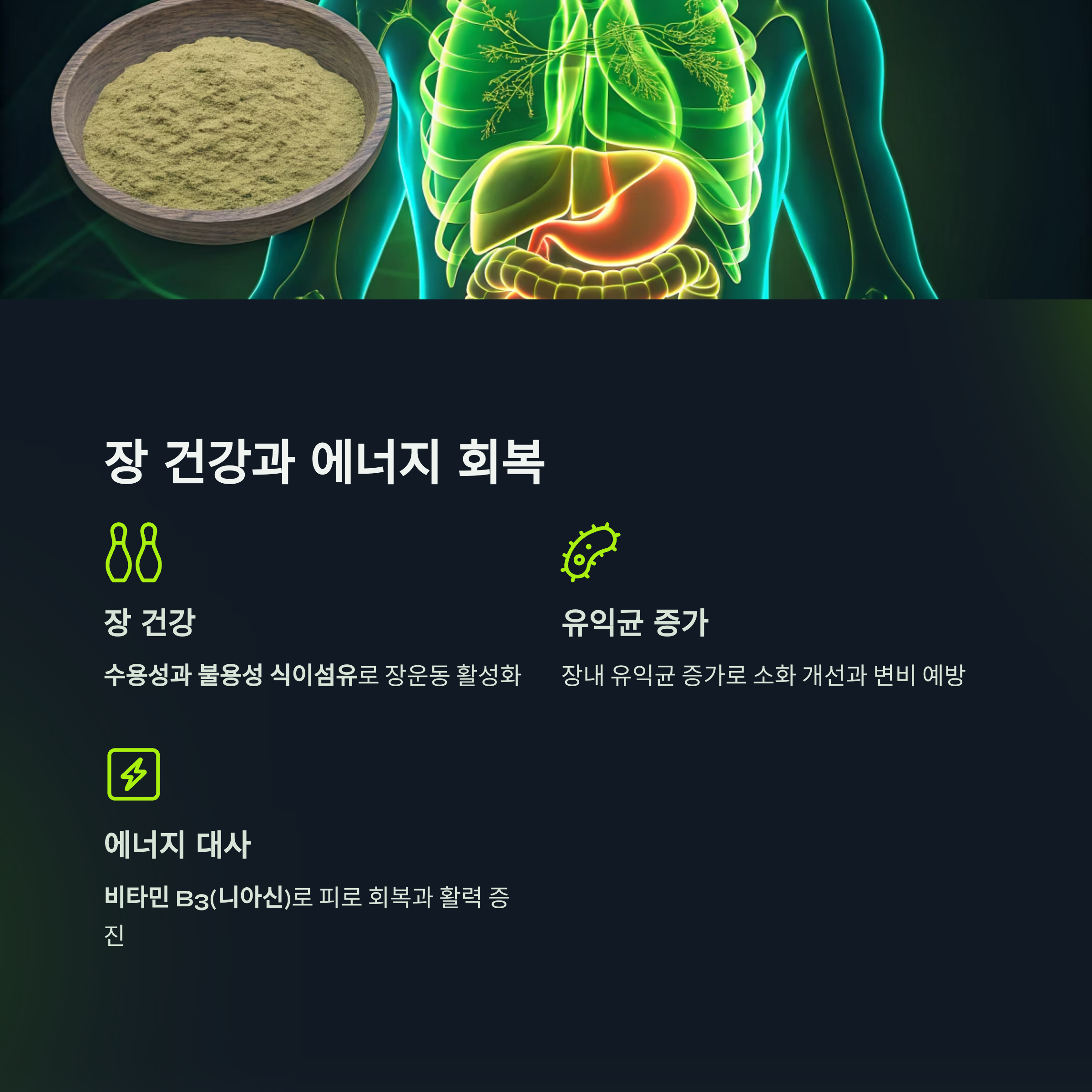 장운동을 활성화하고 유익균을 증가시켜 소화 개선과 변비 예방에 탁월합니다.
