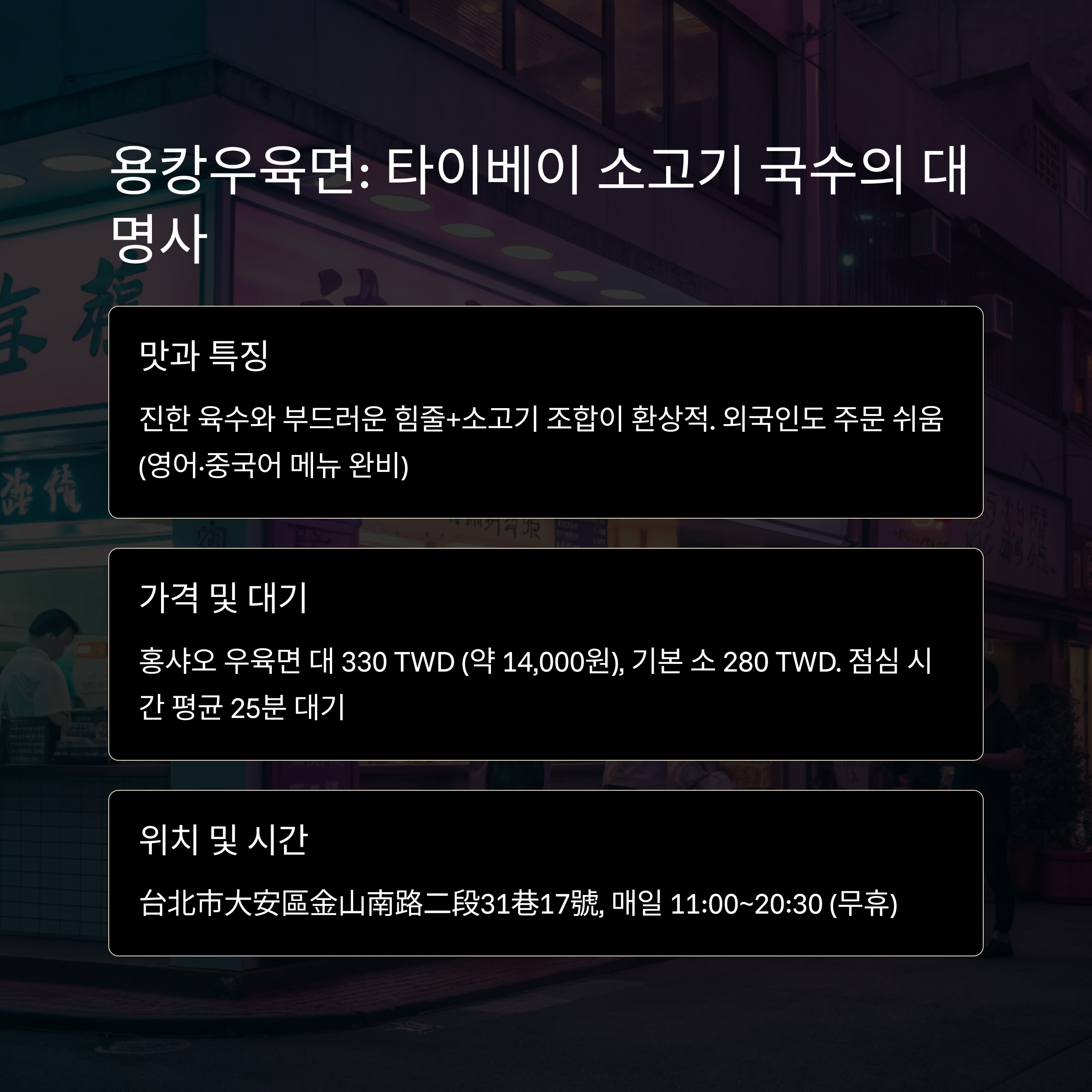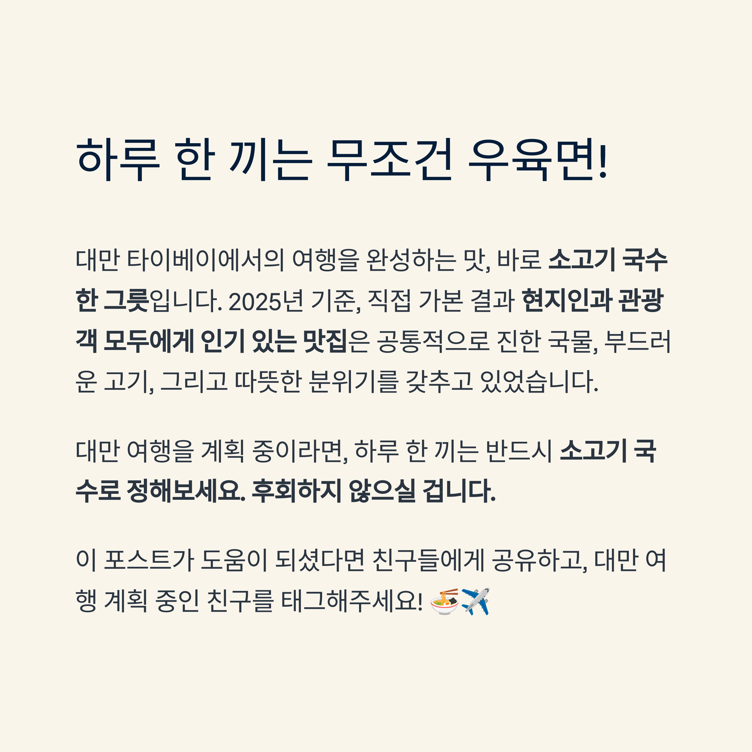 2025년 기준, 직접 가본 결과 현지인과 관광객 모두에게 인기 있는 맛집은 공통적으로 진한 국물, 부드러운 고기, 그리고 따뜻한 분위기를 갖추고 있었습니다. 대만 여행을 계획 중이라면, 하루 한 끼는 반드시 소고기 국수로 정해보세요. 후회하지 않으실 겁니다.