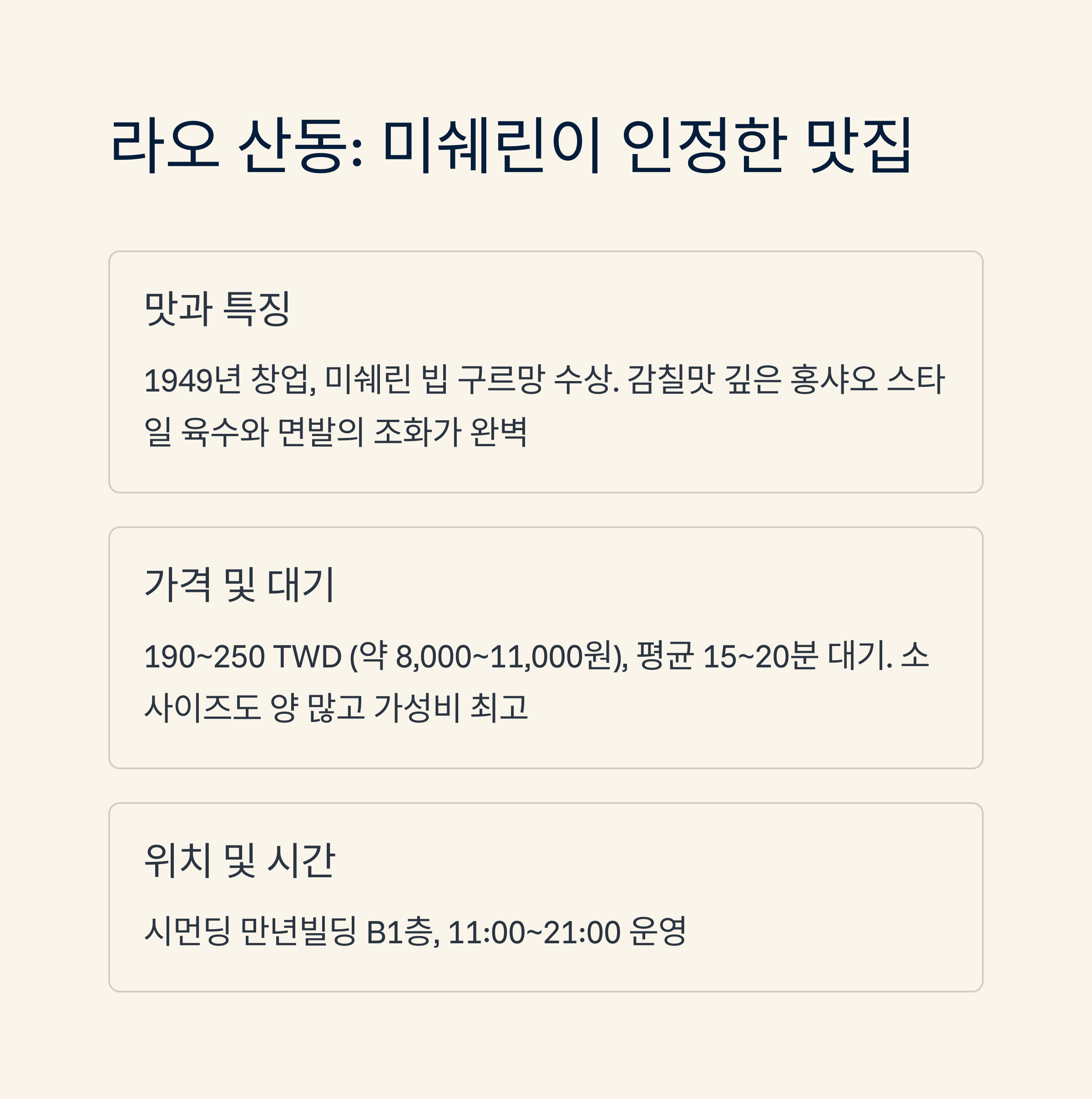 라오 산동 | 190~250 | 15~20분 | 미쉐린 수상, 로컬 분위기 |