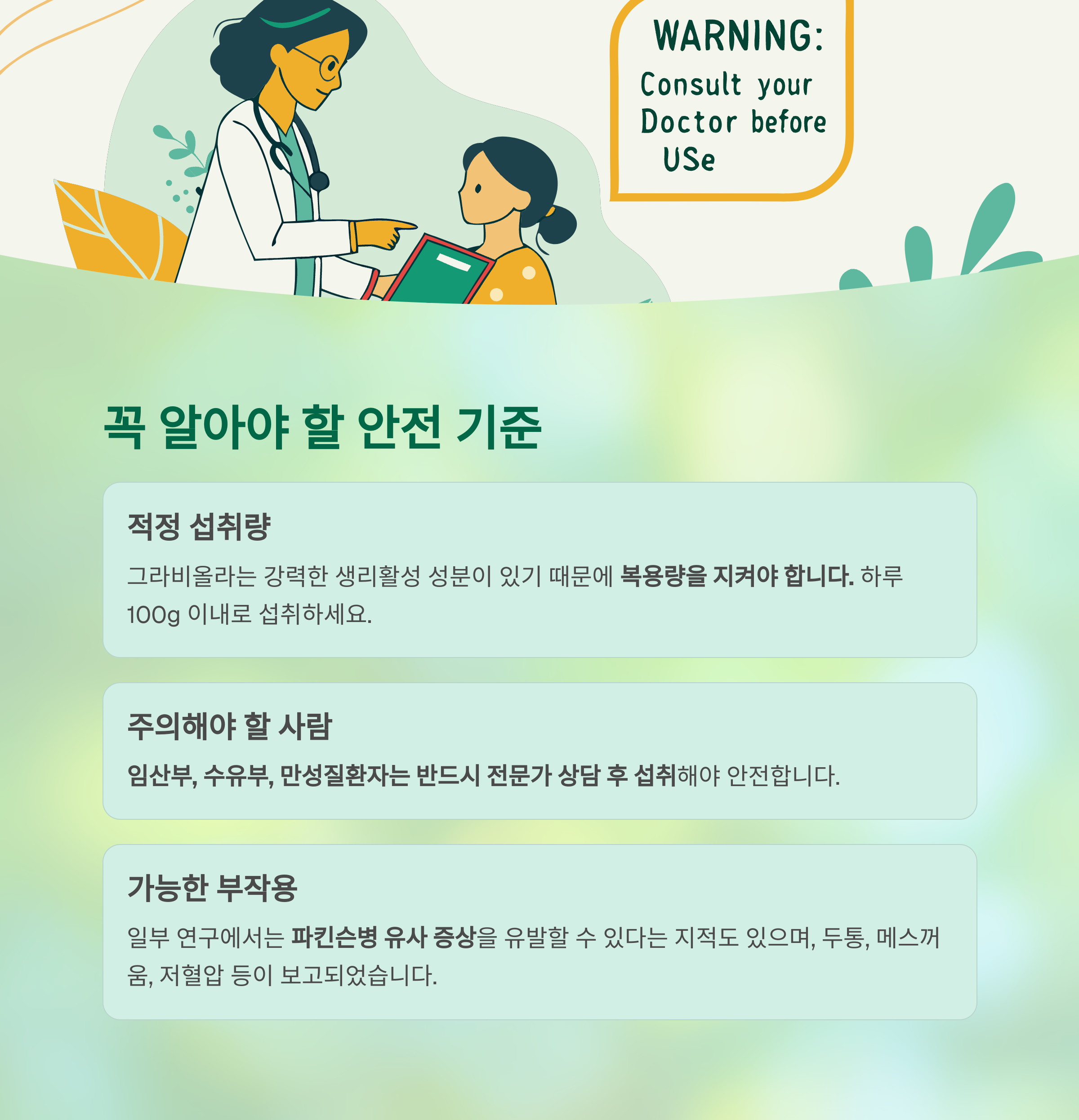 그라비올라는 강력한 생리활성 성분이 있기 때문에 복용량을 지켜야 합니다.