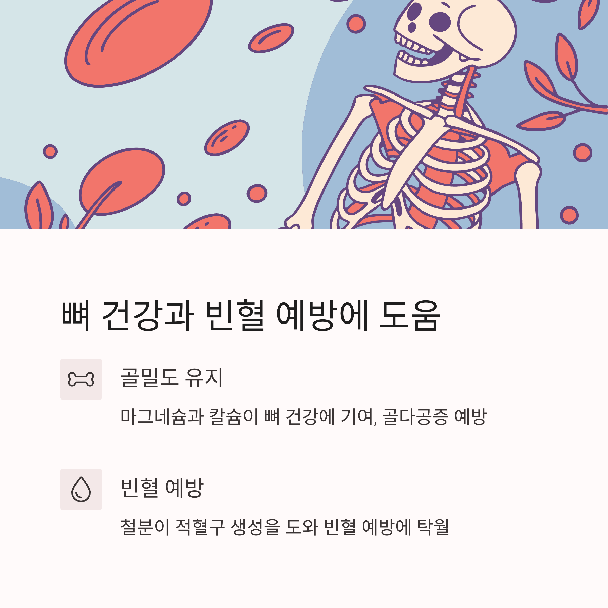 마그네슘과 칼슘이 골밀도를 유지해주며,