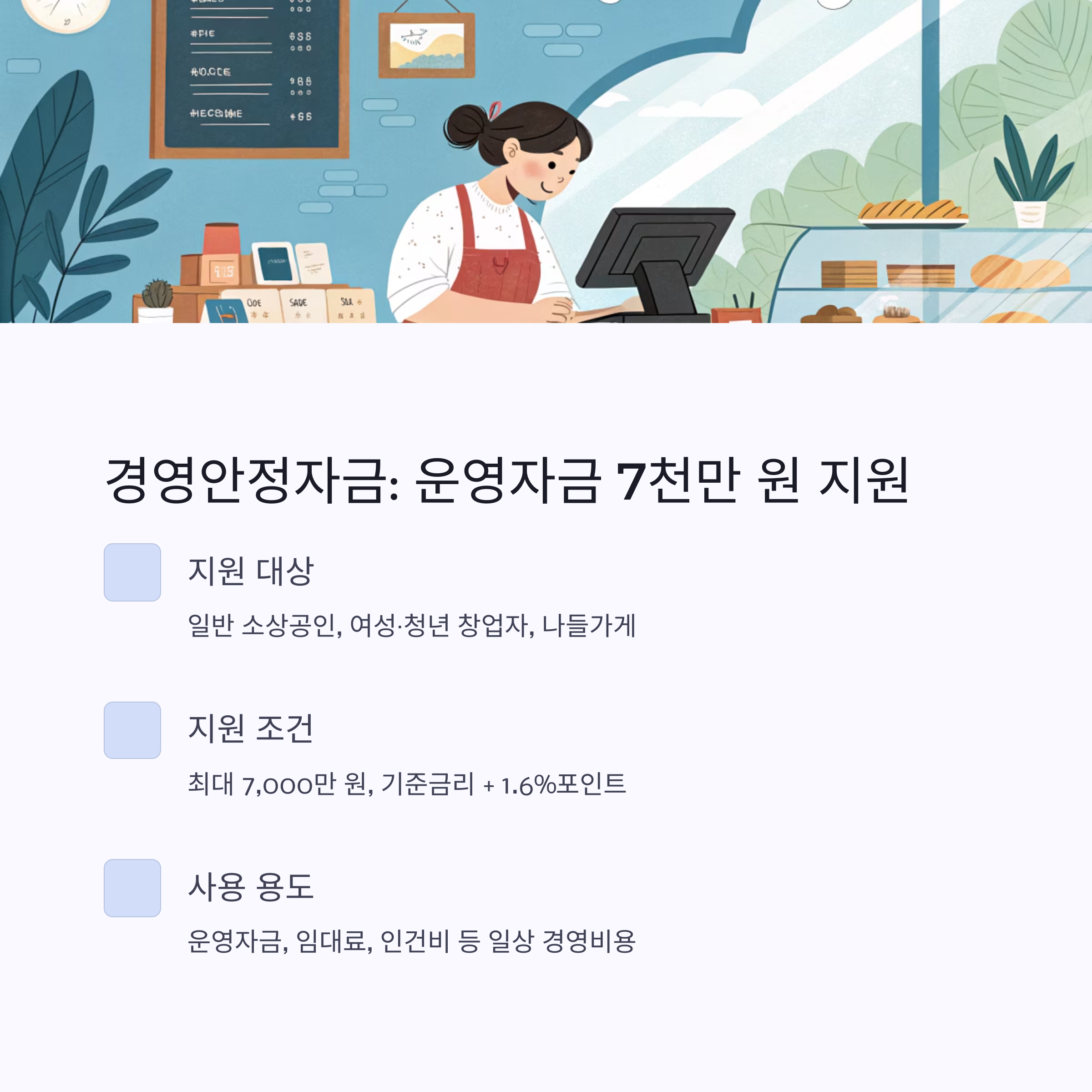 경영안정자금 | 7,000만 원 | 기준금리 + 1.6%p | 일반·여성·청년 창업자 |