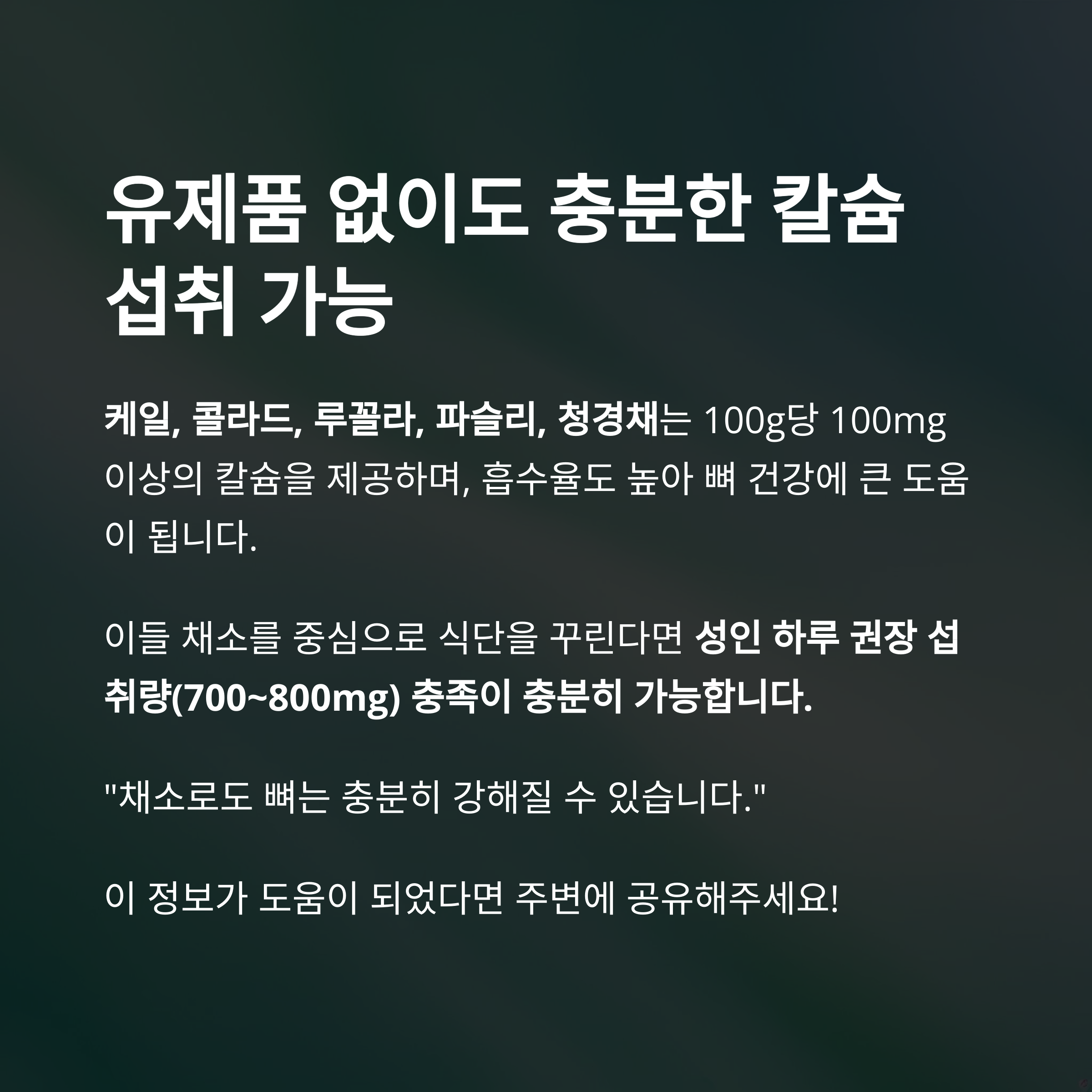 - 유제품을 못 먹는 경우 채소 칼슘 섭취 루틴 확보가 매우 중요
