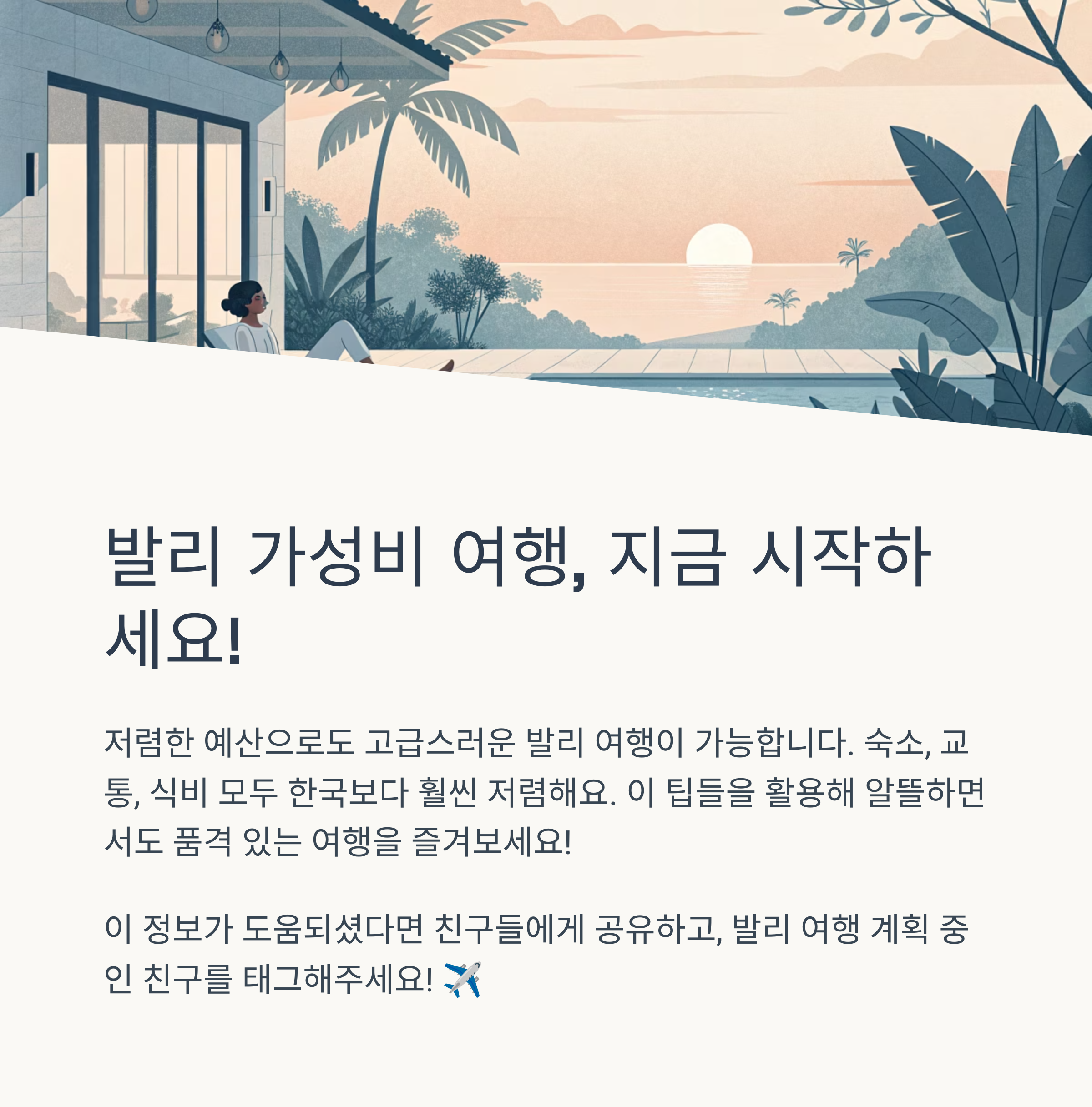 발리는 저렴한 예산으로도 고급스러운 여행이 가능한 희귀한 여행지입니다. 특히 다양한 숙소 옵션과 저렴한 물가 덕분에 부담 없이 고품질의 여행을 즐길 수 있습니다. 교통비, 식비, 액티비티 모두 한국에 비해 훨씬 저렴하며, 여행 팁만 잘 숙지한다면 알뜰하면서도 품격 있는 여행이 가능합니다. 여행 전 체크리스트를 꼼꼼히 준비하고, 상황에 따라 유동적인 계획을 세운다면 더욱 만족도 높은 발리 여행이 될 것입니다.